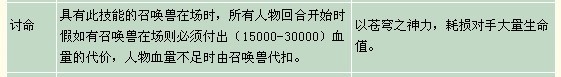 6,讨命/每回合开始时给对方携带召唤兽的玩家造成15000-30000的伤害,若气血不足,则由召唤兽代扣。若己方有多只携带该技能的召唤兽参战,技能伤害不叠加。 官方的技能描述让我蛋疼,看了半天,才知道描述的是这个意思。 这个技能对负敏鬼相信是一个沉重的打击,尤其是在女鬼魅惑和女人毒的双重夹击下,外加召唤兽技能讨命。可以说是起到了秒杀的作用。 或者此技能也可以与悬刃搭配,给对方敏魔造成秒杀也是很有可能的。难道以后敏魔参战要不携带召唤兽才可以么?