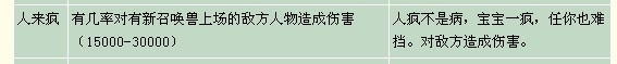 7,人来疯/有几率对有新召唤兽上场的敌方人物造成15000-30000的伤害。 好吧,刚才豁然开朗了,这个技能确实蛋疼,当敌方有人召唤新的宝宝时,会给对方造成一定的伤害。 会不会以后大话的PK会出现五个人VS五个人。完全没有召唤兽什么事呢?其实这个技能挺鸡肋的,因为并不是百分百造成伤害,而是有一定几率造成伤害,因此这又是一个噱头大于实际意义的技能!