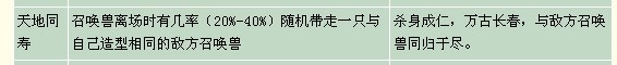8,天地同寿/召唤兽离场时有几率(20%-40%)随机带走一只与自己造型相同的敌方召唤兽。 又是一个看似很强大,实际很蛋疼的技能。目前的PK战斗中,如果说什么召唤兽的作用最明显的话,那么很显然就是血宝宝了。首先我们要注意一点,这技能里说的是和自己造型相同的召唤兽,也就是说,你拿一只普通的海龟就有可能把对方的神兽龟带走,一只普通的剑精灵就有可能把对方的神兽剑带走。或者说,你拿一只小五叶,就把对方大五叶弄死了也说不定呢! 当然,我们用这个技能的时候还可以蛋疼点,上面说的是召唤兽离场,离场并不代表死亡,还有可能是召唤兽被召还!那么,当己方的一个超敏单位携带了一只神兽年。并且在第一回合使用了召还,那么是否代表着对方如果有神兽年的话,也有可能直接被带走呢?难说,难说哦……