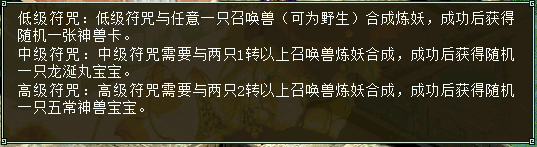 符咒的功能: 低级符咒:低级符咒与任意一只召唤兽(可为野生)合成炼妖,成功后获得随机一张神兽卡; 中级符咒:中级符咒需要与两只1转以上召唤兽炼妖合成,成功后获得随机一只龙涎丸宝宝; 高级符咒:高级符咒需要与两只2转以上召唤兽炼妖合成,成功后获得随机一只五常神兽宝宝; 神兵:收集到50片神兵碎片后,去何大雷处可以合成随机一个神兵。 以上成功率均为:100% 更多游戏资讯请访问叶子猪游戏资讯中心:http://news.yzz.cn/ |