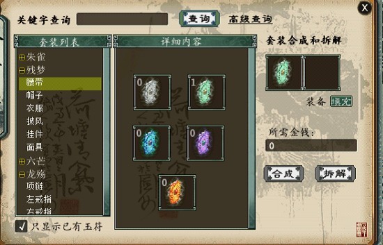 我来给大家演示一下吧,在套装集里面找到想要合成的玉符,右键再点击装备后面的填充,选择相应部位的装备, 就可以进行合成了。 提示:合成时,请注意套装的性别需求。 详解1