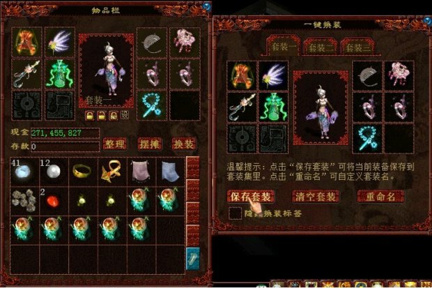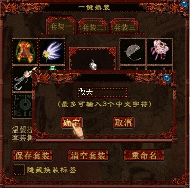 随着游戏内装备的增加,大家对于快速换装的需求也越来越大,有鉴于此,我们相应地推出一键换装功能。 闲话少说,先来介绍一下简单功能与使用步骤吧。 1、 打开物品栏,点击“换装”,选择“换装设置”。 2、 弹出设置界面,选择“保存装备”,就将当前穿的装备保存下来了。 3、 选择“重命名”,输入名字,可以自定义套装名字。 |