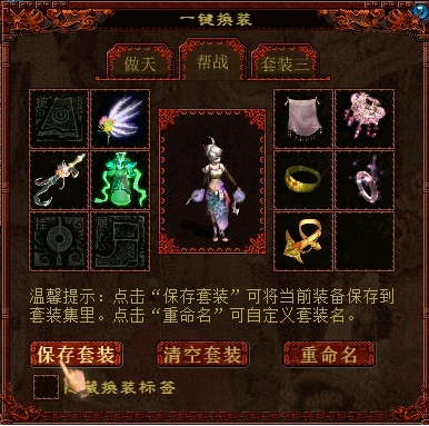 4、 这样的话,当玩家穿上相应套装时,任务栏里也会显示对应的名字。 5、 同时换装按钮下系统原先默认的名字,也会相应修改成玩家定义的名字,以便大家可以快速辨别换装。 6、 同理,第二、三套装备的保存,也如上步骤。 7、 当玩家不希望保留此套装时,选择“清空套装”,将已保存装备清空,可重新进行保存。 8、 已经被保存的装备被换下来之后,会有“换”字的标签显示,以便玩家在存放装备到当铺时,又或者保存外形相同的装备时,不至于弄错。 9、 如果大家觉得标签不美观,而自己也不需要的话,可以在换装界面中的“隐藏换装标签”选项打勾。 10、 当玩家已经保存了一套装备,而后如果其中某一部件已经不在身上,那么当玩家使用此套装的快速换装时,在允许玩家换装的同时,也会提示你“某某部位缺失”。 小提示:摆摊、战斗、大闹天宫、交易中无法换装。 本功能将在游戏试玩先行测试,欢迎广大玩家参与测试,并给我们提供宝贵的意见和建议,我们将尽力改善,争取做得更好。 更多游戏资讯请访问叶子猪游戏资讯中心:http://news.yzz.cn/ [编辑:星陨]