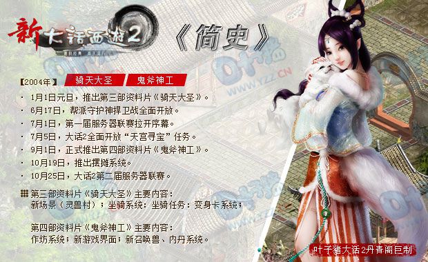 我们留意到有很多玩家比较关注大话的历史,但又迷惑一些历史的发展。对此,叶子猪丹青阁的几位同学近日抓紧时日赶紧制作:新大话西游2简史!特此奉献给大家!希望大家喜欢!十一年风雨同路,我们与大话2不离不弃! <<<点击进入大话西游2论坛发表你的看法>>>
