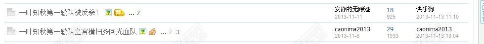 以下内容纯属本人个人看法,如有雷同纯属诈尸,如有不同,纯属巧合。 一叶最近事件不少,咱一件一件的说: 说之前先说下区里情况:据说一叶知秋近期土豪颇多,物价飞涨,点卡跌至380万。部分飞升后所用的筋骨等更是难求,而土豪多了,洗仙器的就多了,悔梦价格也是一路飙升,五阶和化无有涨价的趋势,化无已经摆到26000.听说前不久成交的化无价格也已经到了24000。 再说下帮派实力和帮派之间的关系:通过帮派实力榜和练功狂人榜,大家应该也看出一些,练功榜前十五名全部是梦雨楼兰和柔情天下的。帮派实力方面,梦雨仍然稳居榜首,柔情和快乐谷差距不大,据说上周柔情只是输在挑战。前三名的关系方面,梦雨与快乐谷关系紧张,前不久还有封修事件,虽然后来只是皇宫PK,但是注定关系紧张,梦雨与柔情之间近期内看来,关系比较暧昧,虽有小规模冲突,但是在面对快乐谷的时候他们又能同仇敌忾,柔情与快乐谷之间那是相当紧张,皇宫战火不断,前几天铃铛满天飞。而其他帮派也是冲突不断,柔情与剑气的录像门事件,残舞与红楼的帮战门事件,全服公敌与剑气的大闹事件等等,一叶皇宫可谓忙坏胡敬德吓坏李世民。 TOP10。柔情天下 一叶知秋第一个二级街坊 问号土豪年 TOP9。天下第一 未见土豪队伍报名 三个小资血队报名,不知道别的区里怎么样,本以为竞争会很激烈,不知道是不是小联赛更不得人心了? TOP8。江山家族血队现身皇宫 江山家族大部分是外区移民而来,一直只闻其名未见其声,只知六阶配置,多终极血队,众所周知,老一叶知秋的血队一直较少,特别是一叶家族血队清号以后,更是没有土豪,而合区前肝胆相照和剑指八荒的血队,比如本尊,王者,梦家族等等豪强也都已各奔东西,所以对于江山队伍的出现,我们还是很期待的,说到那录像,本人私下认为是快乐谷的个别人所为,绝非江山队伍所发。 一叶知秋第一血队诞生,快乐谷江山家族异军突起 http://bbs.yzz.cn/forum.php?mod=viewthread&tid=5193510&fromuid=4763431 我说说快乐谷这个帮派大家也就会明白我所说的内容,快乐谷在一叶知秋一直属于平民帮派中的佼佼者,因为帮主采花犯的坚持帮派发展的不错,特别是在暮色年华土土崩瓦解以后吸收了很多暮色的主力,而跻身前三,也是一叶比较和谐的平民帮派。合区后更是吸收了很多玩家,慢慢发展壮大,无奈一直没有土豪队伍撑起门面,所以被梦雨柔情一路压制,虽然后来出现了甜甜家族队伍在皇宫与梦雨和柔情的血队拼杀,终归没有绝对的优势。此次大雁塔,贝贝不乖,江山家族的加入,让从未有过土豪的快乐谷着实吃了兴奋剂一样急于表现自己的实力,所以就有了近期皇宫的一幕幕拼杀,有了论坛一个个快乐谷队伍胜利的帖子。 TOP7。逍遥队伍重出江湖 逍遥队伍关注叶子猪的玩家也肯定熟悉,在一叶的小资血队中是佼佼者,在物资有限的情况下,利用自己默契的指挥和配合取得了不错的战绩。曾经与梦雨楼兰的西门吹雪发生过一段恩怨,但是我还是希望玩家多关注PK本身。飞升以后此队伍销声匿迹,这次重出江湖就小胜梦雨血队逍遥生队。据我了解逍遥生队伍也在重新调整,让我们期待他们下一次的碰撞。个人比较欣赏这俩个队伍的PK,没有口水,只有战术的对决。 TOP6。录像门事件 大闹门事件 录像门----- 发录像本身没有错,但是请你不要夸大其词,否则有可能后果很严重。 你躺枪了,对方肯道歉也就行了,俗话说得饶人处且饶人啊,非要皇宫见血才罢休,这真是江湖事情江湖了啊! 双方帖子如下 : 一叶知秋视频事件 http://bbs.yzz.cn/forum.php?mod=viewthread&tid=5184975&fromuid=4763431 一叶录像事件 http://bbs.yzz.cn/forum.php?mod=viewthread&tid=5186793&fromuid=4763431 就着这事,我来说说我一直想说的问题,屌丝逆袭到底该不该大肆宣扬?我先说个事,一天我跟一个土豪朋友聊天,我问他为什么最近都不去皇宫PK,他说俩个原因,一个是没有队伍跟他们P,一个是就算有队伍了,去皇宫也是先口水,然后打十场,赢9场输一场,那么不管那9次赢得多精彩,大家记住的都是你输的那一次,而骂你垃圾。还有一些队伍约你皇宫就是赌那几率,赢一场他们也可以大肆宣扬,他们赢你了,然后就是无休止的口水。输赢虽然不能看的那么重要,但是这些口水让人反感。 不知道这句话是不是说出了很多土豪的心声。屌丝逆袭本来是值得鼓励的,让我们这些屌丝看到了逆袭的希望,但是逆袭以后的口水,逆袭以后对土豪的贬低是否应该适可而止,不要到了最后连逆袭的机会都没有了,因为土豪不和你杀了. 大闹门事件--- 因为大闹扯出的恩怨 http://bbs.yzz.cn/forum.php?mod=viewthread&tid=5186880&fromuid=4763431 TOP5。第一敏队到底是不是第一,第一敏队在皇宫到底赢没赢一叶福笑天 一叶知秋第一敏队皇宫横扫多回光血队 http://bbs.yzz.cn/forum.php?mod=viewthread&tid=5188289&fromuid=4763431 一叶知秋第一敏队被反杀! http://bbs.yzz.cn/forum.php?mod=viewthread&tid=5191409&fromuid=4763431 起因大致就是这个帖子,我先说下这个所谓“第一敏队”的配置,我肯定的说在大雁塔之神来之前绝对属于一叶二线队伍,据我了解,男人(自称一叶第一敏人)为四阶配置,俩个男魔,武林配置相对较高,也只能称做小资。影子李,在一叶众多男魔里,前十名都是个问题,而俩个大炮,其一为五阶,据说有一个还是普通配置,全队无终极和年。此队伍曾多次与柔情帮主朝朝暮暮队伍皇宫PK,输多赢少。 而前不久移民来一六阶男魔-