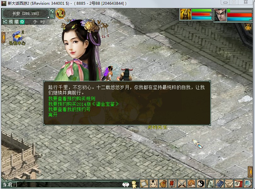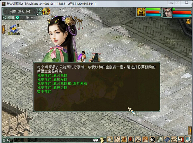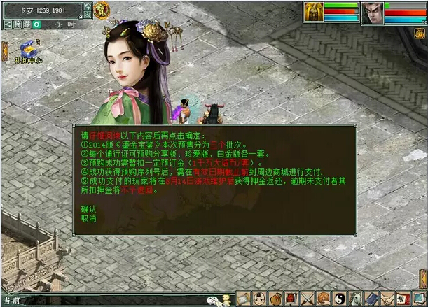 铛铛铛!2014新鎏金宝鉴的内容介绍介绍如下: 老规矩:三个档次,三通不同类型的包装! 分享版:198元 珍爱版:398元 白金版:1098元 2014款宝鉴内如下: 分享版: 内容:召唤孔雀明王(1)+新大话西游2主题笔记本(1) 珍爱版: 内容:召唤兽孔雀明王(1)+孔雀明王元气丹(1)+时装扶苏(男)静女(女)(1)+12周年纪念水晶球音乐盒(1)【飞剑侠版或媚灵狐版随机发放】+新大话西游2主题笔记本(1) 白金版: 内容:孔雀明王 召唤兽(1)+孔雀明王元气丹(2)+时装扶苏(男)静女(女)(1)+新大话西游2主题笔记本(1)+12周年纪念金属U盘(8G)(1)+12周年纪念册(内含纪念邮品&纪念银币)1本(1) 预购流程 1、登陆进入游戏,提前到达NPC“新大话庆典大使”位置。 温馨提示:以下表格均为可点击进行预购的NPC坐标,但8月15日后激活“虚拟奖励序列号”只能在“新大话庆典大使”NPC长安城(266,188)进行操作。 “新大话庆典大使”NPC坐标列表: 2、与之对话,选择“我要预约购买2014版鎏金宝鉴”。2014年8月8日-8月14日期间,《2014版鎏金宝鉴》将分三个批次售卖。。 第一批:8月8日晚19:30。《分享版》4000套、《珍爱版》32000套。 第二批:8月10日中午12:00。《分享版》800套、《珍爱版》7500套、《白金版》5000套。 第三批:8月12日晚20:00。《分享版》余量、《珍爱版》余量、《白金版》余量。 3、系统会弹出二次提醒界面,请仔细阅读后点击确定。 (温馨提醒:预购未开始前,可提前点击“我要查看预约购买规则”,提前做好功课,待预购开始后可直接确认,节省时间)。 4、接下来便是选择要购买哪些版本的《2014版鎏金宝鉴》,点击预购,若成功则该ID扣除押金1千万大话币/套。若该ID身上不足1千万大话币/套,则预购失败。 (温馨提示:本次分为珍爱版、分享版、白金版三个版本,每个ID可预订分享版、珍爱版、白金版各1套) 5、若玩家满足预购要求,且当前所选择版本还可以预购,则玩家即可成功完成预购操作,得到“预购序列号”,则必定能在规定的购买时间内到周边商城完成购买,故请不要重复预购。 (温馨提示:1、玩家选择对应预购的版本后,系统会检索并扣除玩家随身携带的大话币作为预购押金,若携带数量不足则无法获得预购资格。 2、玩家可点击“我要查看我的预约号”,查看已成功预购的序列号。) 6、获得“预购序列号”后请尽快到周边商城进行支付。每个批次的预购序列号都有有效截止日期,请在截止日期前进行支付。 (温馨提示:成功支付的玩家将在8月15日后获得押金返还,逾期未支付者其所扣押金将不予退回) 备注: 1、预购成功但未在每一批次对应的规定时间内完成下单购买的,视同放弃预购资格,押金1千万大话币/套不予退还。 2、由于《2014版鎏金宝鉴》数量有限,若预购数量额满后,即停止预购。 3、预购的ID等级必须大于等于70级(转生玩家不受此限制),时间宠大于等于10级。 |