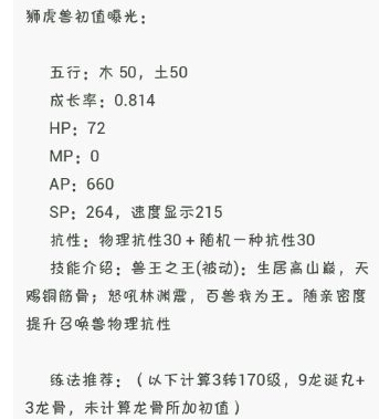 狮虎兽算是出的比较失败一个龙涎丸宝宝,数据平庸,而且造型也不出众。我们一起来看看实际效果。 >>推荐阅读:大话西游2这技能太鸡肋:别猜了狮兽初值技能大曝光 [编辑:岁聿暮年]