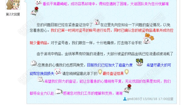 这到底是那门子的事。我自己的小号盗取了我自己的大号,还对我自己的小号进行罚款处罚 太荒唐了。我就举报了一个游戏漏洞 结果一身正气却碰的满脸污泥。经过2天,系统工作人员终于帮我处理好了,退还了罚款,装备从二品侍卫取下的本该有20天的时间锁,也帮我取消了。当然 我也付出了代价 光打客服的电话费就花了上百块。 对于这个事件我想说3个不满。 第一:客服GM不作为,对待玩家所反馈的问题不重视,我可以肯定这个GM基本连我的问题我的题目看都没看 就直接一键粘贴回复 转交技术人员处理。 第二:技术人员不作为,3个账号全在一部电脑,就我一个人在上,难道技术人员鉴别不出3个账号IP地址是一样的?这样的草率我不知道会不会给不法份子利用。 第三:官方论坛管理员的不作为,网易公司作为一个规模这么大的公司 员工出现如此低级不负责的错误,玩家想通过论坛发个帖子来发表这个事件 既然不让我发布,难道只允许你们王婆卖瓜自卖自夸 不允许玩家发表自己的看法 抒发自己的游戏体验。那么这样要游戏论坛让玩家交流什么 以后这样的事情继续发生 ? 最后我想总结下这个事情:一个错误造成网易公司多个部门的资源 人力的浪费,对我游戏的困扰,其实这一切都可以避免,玩家煞笔式的坚持,却看不见网易的真诚对待。当然,我希望以后不会再出现这样我这样的例子,希望GM能真诚的对待每一个客户,做玩家的贴心人! <<<点击进入大话西游2论坛讨论>>> [编辑:小七]