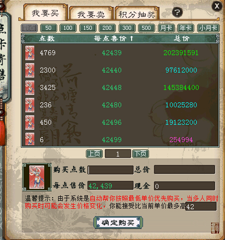 大家好,从今天开始,每周为大家带来一期特别的物价系列节目,走近各大热门服务器,探访各种热门道具以及高端的召唤兽、仙器等价格,让大家看看大话最新最前线的物价走势,对比各大服务器来反应整个大话的经济体系。 今天第一期我们来到的是小资圣地——凌烟阁,请大家跟随小贝的脚步一起来看看,这个聚集着众多小资玩家的服务器的经济底蕴,我们从各种热门的道具看起,最后会一一奉上本服务器最贵最精品的内容,这就开始吧! 走进一个服务器,最先要看的就是他的点卡价格,这最能代表整个市场的火爆程度: |