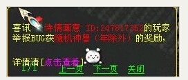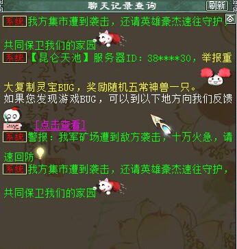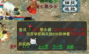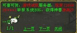 话说近日昆仑天池服务器发生了一件大事,系统频道突然出来一条消息:有玩家发现灵宝复制BUG,举报后获得五常神兽一只! 一时间整个服务器沸腾了,众人也纷纷讨论起关于发现BUG改不改举报的问题,有人说他傻,这么好的BUG不自己留着发财;也有人说被发现就直接没收所有,偷鸡不成还蚀把米,不如举报了还有神兽拿;也有玩家说,无论有没有奖励,发现了对游戏系统不利的漏洞,都应该善意提醒官方,让他们及时更正,保护更多玩家的利益。 各方论点不一,争论火热,不知您对此事件怎么看呢?我们先来看看今天在昆仑天池系统发生的这一幕: 不管怎么说,这位玩家已经获得了神兽的奖励,他的善意得到了极大的回报,有这样的结果相信是双方都非常满意的!那么下面就带大家来看看,这些年曾经举报BUG获得神兽那些玩家,那些瞬间,从某种意义上来说,他们都是大话的功臣: |