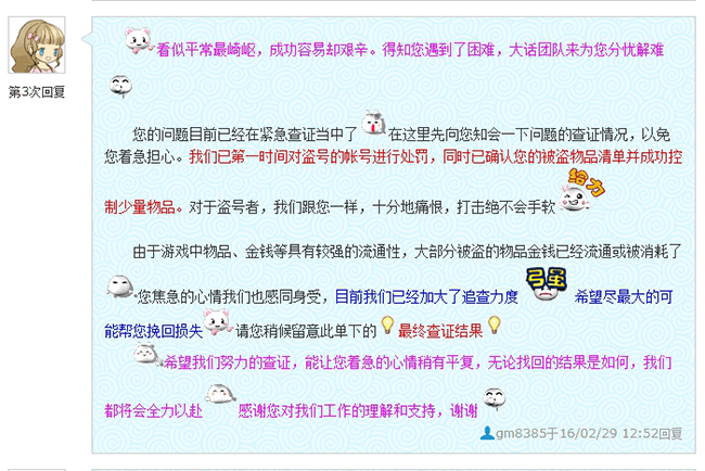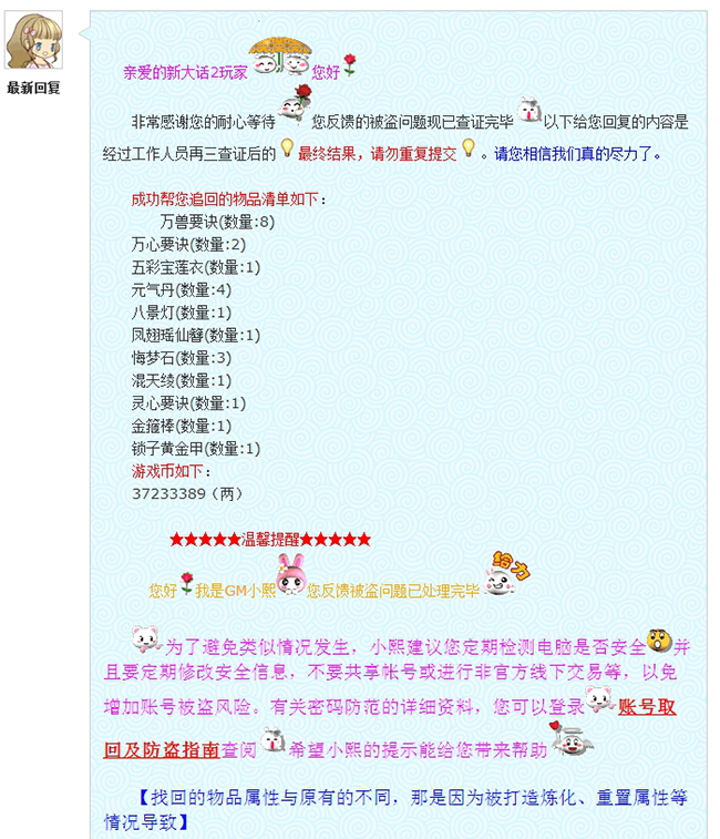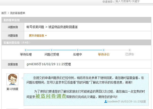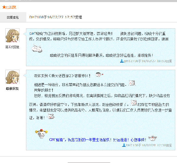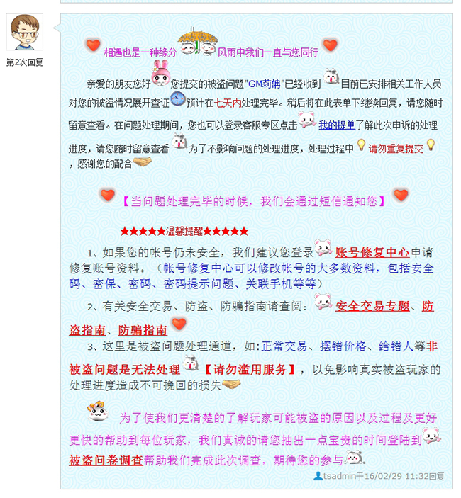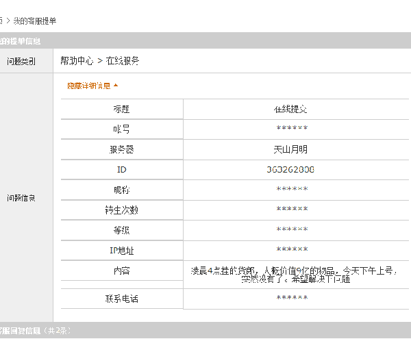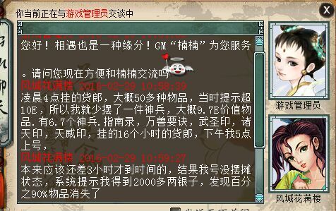 此文来源于玩家,不代表叶子猪观点,叶子猪仅作报道。 以下是玩家的自述: 我是个上班族,每天上号挂个货郎就去上班,没想到出这问题。 那天我又和往常一样离线摆摊以后,第二天上线竟发现出售的物品90%都没有了,钱也没得到,好伤心。 玩家采访: 叶子猪记者:你好!怎么称呼你呢? 风城花满楼:我叫风城花满楼,天山月明区的。 叶子猪记者:你是什么时间离线摆摊的呢? 风城花满楼:2月27日凌晨4点12分左右。 叶子猪记者:摆了多久? 风城花满楼:离线16小时的。 叶子猪记者:那你是什么时候上号发现物品丢失的呢? 风城花满楼:下午5点左右上号,发现物品百分之90%没有了,上架的物品货郎没退还给我,只得到2000多两大话币。而且明明还差3小时,货郎才会没有,上号发现没有摆摊,已经是离开了。 叶子猪记者:是在28日发现的吗? 风城花满楼:27日的下午。 叶子猪记者:这样啊,那你当时有采取什么措施吗? 风城花满楼:我第一时间给客服打了电话,按照他说的在游戏里面找了游戏客服,提交了这些问题,她说做了笔录,提交给其他客服,让我等待,一直等到28日中午12点,才说让我在提交丢失物品详细信息,我当时的是大概50多个物品,没记太清楚,然后又找了另外一个客服来处理此事。 叶子猪记者:另外一个客服是你找的吗?还是官方换了一个客服? 风城花满楼:昨天下午我没在家,当时也没时间弄这些,今天上午回到家第一时间查看此事,发现物品还是没着落,只好我自己又找了个客服。当时心情很急。 叶子猪记者:那这个客服是怎么给你回复的? 风城花满楼:第二个客服说帮我去查证一下,查证结果告诉我27日我的角色出售了大量的物品,而且都是以1游戏币出售的,当时我就惊呆了。我记得摆摊的时候还提示我超10亿,无法挂货郎。我就下架了一个神兵,大概是9亿多,才让挂的货郎。我说我不可能摆这个价格出售,客服说货郎绝对没有问题,告诉我摆错价是无法处理的,如果存在被盗信息可以去提交一下被盗申诉,我只好去填写被盗申诉了。 叶子猪记者:那之后的结果怎么样呢? 风城花满楼:追回速度很快,回来一半左右的物品。 叶子猪记者:下一步你打算怎么办?就这样算了? 风城花满楼:我也很苦恼,玩大话头一次出现这个问题。挂个货郎就清号,以后绝对不会在挂货郎了。 叶子猪记者:你有没有去查看一下IP,确认下自己到底是被盗号了,还是系统出问题了导致这样的结果? 风城花满楼:查看了IP,没有任何人上我号,而且将军令就我一个人有。我没有被盗,系统出的问题。 叶子猪记者:好吧。你还有什么想和大家说的吗? 风城花满楼:我希望能得到客服的重视,平白无故让我损失很多。就算物品被消耗了,退给我一些大话币也行啊,最起码4亿没有了。 叶子猪记者:好的。小编也希望官方能帮你追回更多物品。 风城花满楼:好的,谢谢小雨记者。 叶子猪记者:不用谢!感觉你对叶子猪的支持! 风城花满楼:支持叶子猪,支持叶子猪记者,支持小雨。 客服申诉: 第一次申诉无果后,风城花满楼又继续在客服专区申诉,就在该玩家与记者的交谈时,GM联系到了他,一起来看看吧。 风城花满楼觉得自己不可能以1大话币出售物品,所以按照GM的指示又以账号被盗申诉: 最终,客服很快速的为玩家找回了部分丢失物品,价值大约3亿多,让玩家减少了部分损失。 这个事件真的很奇怪,玩家心里一定也憋屈,不过好在客服帮忙追回部分物资,心里还能有些许安慰。 <<点击进入大话西游2论坛讨论>> [编辑:小雨]