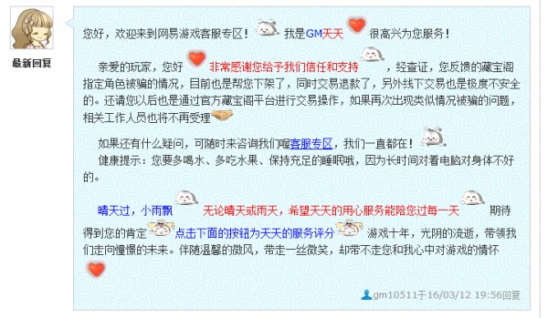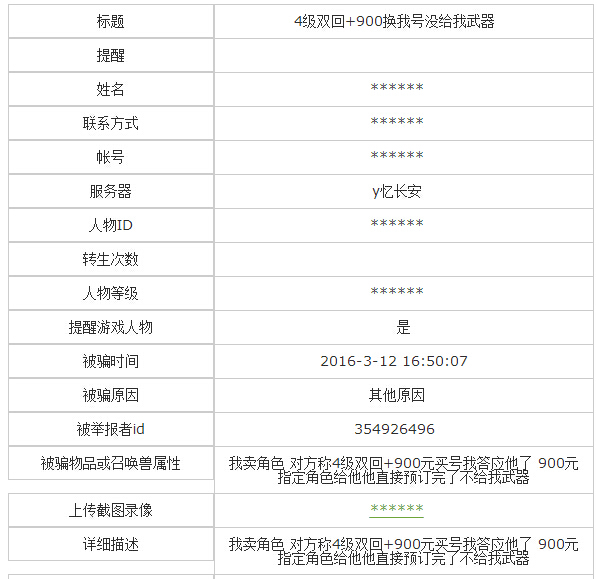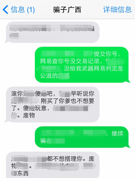最后再说一件事,这个骗子的大号叫忆肉肉,是买的号,他们家族还有个叫忆残阳的也在卖号,他也想买人家号,不知道从哪弄到了残阳本人手机号,给残阳打电话让残阳号便宜卖他,人家不便宜就发短信骂人家 也用那个恶心人的软件,让人家都换号了... 大家以后要注意了,再遇上这类事件的时候,就连自己的手机号也要慎重才是! <<<点击进入大话西游2论坛讨论>>> [编辑:韦小贝]