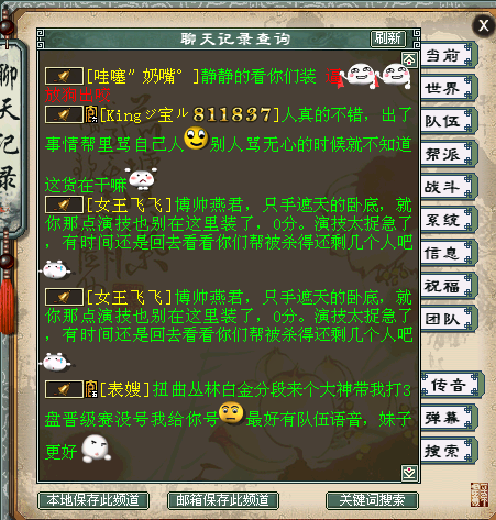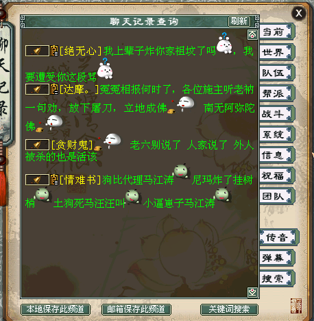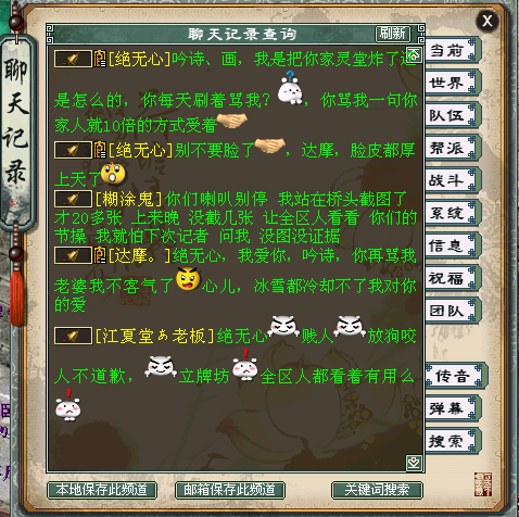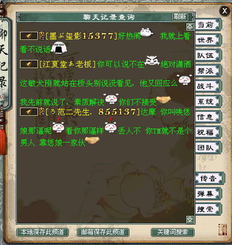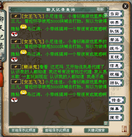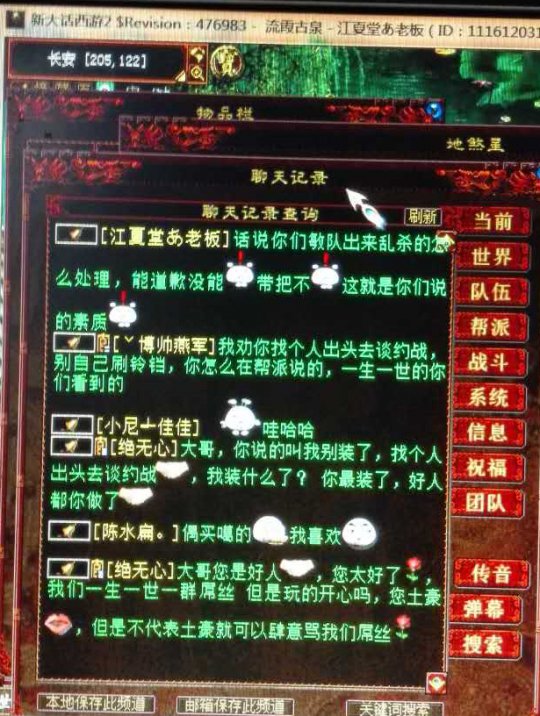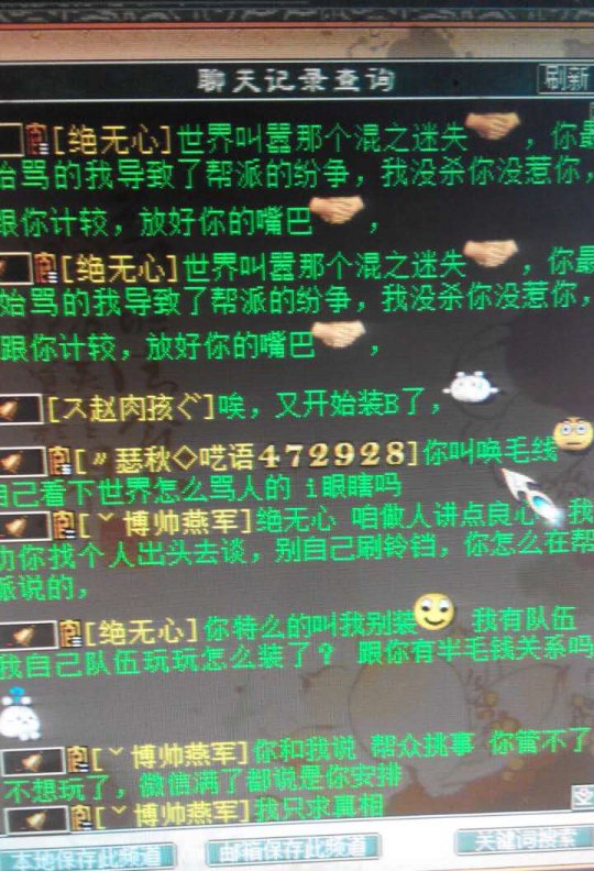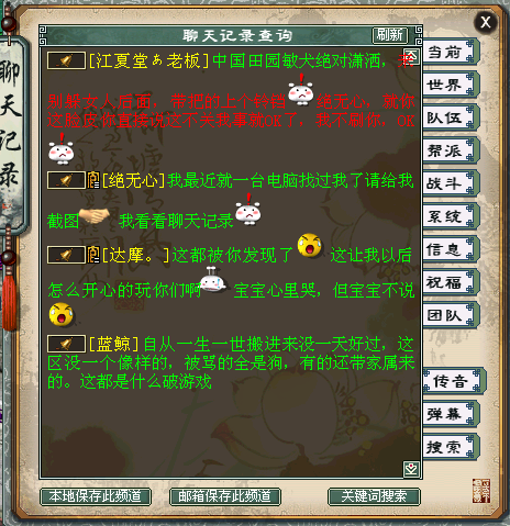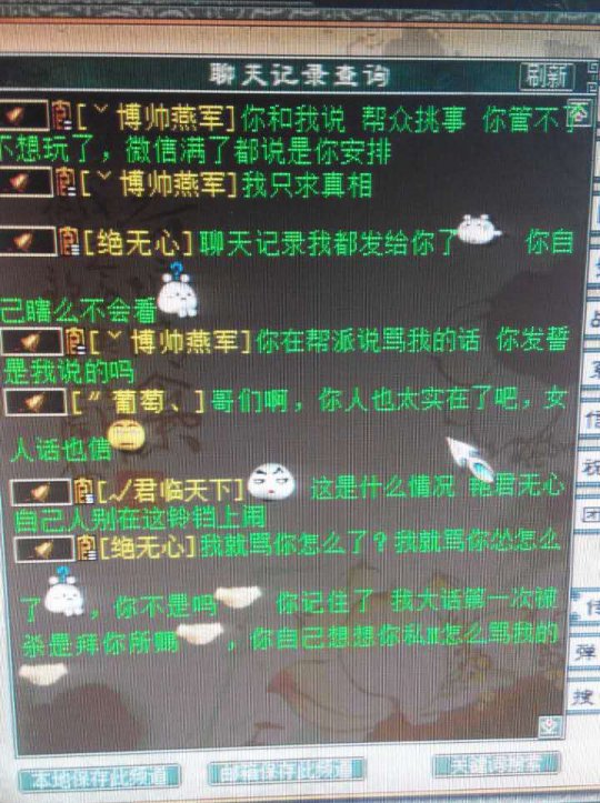 一个女玩家肚兜将流霞古泉服务器一生一世与只手遮天两大帮厮杀掀向高潮,玩家针对此事件各持态度,相关事件请点击以下推荐阅读进行回顾。 以下为玩家Family丶冷雨的爆料:首先说一下,前几天夏江堂梦因为只手和一生一世的纠纷被误杀,世界上说了很多次要求给个解释,一生一世没回应,今天上铃铛要解释,一生一世帮主不是不在而是无视了,按铃铛的话来说,傅帅燕 应该知道整件事情的来龙去脉。很多队伍里没有只手成员也被杀害,这就是一生一世节操,骂你们绝无心不行,你们骂其他女玩家就行,铃铛上的几个女玩家整件事情都没参与过,却被你们骂出来了。 玩家提供铃铛截图(这个,有恩怨就一定有铃铛,这阵子流霞古泉满屏都是铃铛啊) 铃铛截图