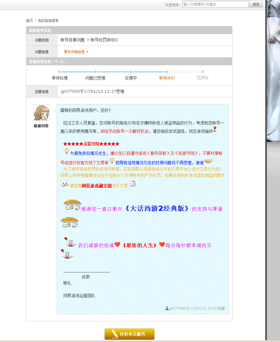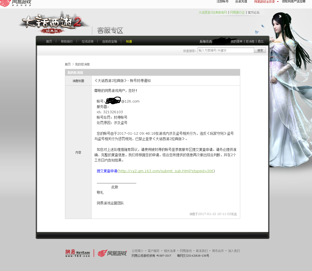 有玩家反映,他的账号在一天内突然被无辜封停和解封,当他找客服讨说法的时候却遇到“闭门羹”,莫须有的中伤让他感觉伤痛。 以下内容来自玩家浮生忘流年、: 首先我先告诉大家,我是蓬莱仙境服的玩家。 角色名:浮生忘流年、 游戏ID:321326103 “势大欺人”,这是10年大话老玩家给网易游戏的一封信。 本人系网易旗下游戏大话西游2经典版资深老玩家,对大话西游有着浓烈的热爱,那是儿时的陪伴、也是一个男儿的英雄侠义梦想的聚集地。 但就是这样的一位老玩家,今天却遭遇了网易的欺凌! 2017年1月12日上午登陆游戏后不久,莫名被踢下线,紧接着就无法登陆游戏,提示本人的账号涉嫌游戏内盗号行为而被封停,可笑至极。本人无奈等至中午12点后联系网易客服专区在线客服,而在线客服的回答让人哭笑不得,说本人账号存在被盗或者盗号行为,所以被封停。但是客服人员无法告知到底是属于被盗还是盗号才被封停的,也无法拿出相关证据或者游戏数据作为判断凭证,就擅自封停老玩家账号,虽然账号于下午13点前后就解除封停了,但是这种说封就封、说解就解、并且不能给玩家释疑解惑的行为,侵犯了玩家的基本权利,必须要求网易给个满意的答复。我们“可爱”的客服人员给了模棱两可的回答,要相关数据或者判断凭证也无法提供。 如果说我的账号存在被盗风险,你封我的账号那还是为我的利益考虑,我能理解,也感恩戴德;但是你也说我的账号存在盗号行为,但是网易又无法提供证据,这是伤了一个老玩家的心,更是一种莫须有的中伤,我有哪种盗取行为?客服无法提供、也无法联系相关数据部门,那么请问还有谁能给玩家释疑解惑呢? 以下是玩家与客服的交涉过程: |