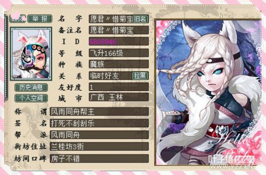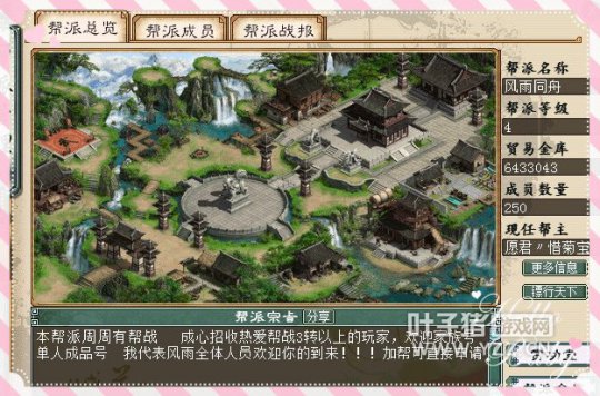 记者绾儿:你好,非常高兴采访到你,风雨同舟帮派在雾影云居的实力还不错,请问这个帮派是你创建至今的吗? 愿君惜菊宝:不是的,这个帮派是我接手的。 记者绾儿:那可以更多的介绍一下帮派的发展历程吗? 愿君惜菊宝:可以,我们是来自折梅问雪的一个老帮派,我们帮一直保持前5的帮派排名,帮里都是由一些平民玩家组成,我接手这个帮的原因也是希望更多热爱帮战的平民玩家加入我们帮,一起发展。 帮派资料 记者绾儿:很不错的帮派呢,那么在帮派发展的过程中有没有遇到什么困难呢? 愿君惜菊宝:困难还是有的,最主要的困难就是帮派人员的稳定性,我想每个帮都一样存在人员流动,我们帮也是,这个是无可避免的。 记者绾儿:那么你们有没有解决的办法呢? 愿君惜菊宝:我们帮有一个微信群,平时除了游戏上都是在群里聊天互动,所以这个问题并不是很严重。最主要帮派很团结,兄弟们都不去惹事,像个大家庭一样。 记者绾儿:这么说来帮派内部的建设以及大家的积极性还是很高的,对于帮战,你们是如何安排的呢? 愿君惜菊宝:对于每个星期的帮战我们都是第一场杀,第二场放弃可以进去杀队但是不能点炮不能点塔,第三第四场要杀,第四场会与我们区第四的帮派碰上,但是我们都能赢。 记者绾儿:对于帮派主打平民的策略,你们在排兵布阵以及挑战方面有什么安排吗? 愿君惜菊宝:我们帮的都很团结,帮战的时候也是有规划的组队。挑战主要由我,合我们帮的一个敏队,很少输,但是碰上土豪队没有办法。 记者绾儿:恩,非常详细,对于今后帮派的发展以及帮派的招募,你们有什么要求吗? 愿君惜菊宝:我想招两队挑战队血敏都可以,但是最主要是想把热爱帮战的平民玩家聚集到我们这个大家庭来。 帮派赏公堂