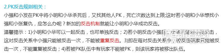 在2017年04月27日停机维护公告里,网易修改了新PK规则,但是只是新增了PK反击规则,下边看看网易对PK反击规则的介绍。 4月27日维护公告:http://xy2.yzz.cn/focus/maintenance/201704/1107366.shtml 我们先来回顾下以前的PK规则: 以前的规则是队伍里有死亡15的的号 然后这个队伍都不能被PK(网易想到这里很多被强行PK的玩家就会逃脱被PK方的报复,所以制订了新的PK反击规则) PK反击规则相关: 小强和小发在PK中将小明和小华杀死后,又找其他人PK,死亡次数达到上限;这时若小明和小华想找小强和小张复仇,应怎么办呢?新加的反击机制就能让小明和小华成功反击。 温馨提示:1)小明和小华可以一起反击,也可单独反击;2)若小明反击小强后,小华只能对小发反击,这对反击关系中小强只能被反击一次,不能被重复反击。3)即在每对反击关系中,被反击玩家只能被反击一次,不能重复被反击;4)若被PK队伍中有玩家不能被PK,则该玩家将被移出队伍。 我简单说明下,我打个比方甲乙丙丁和A的5人关系关系甲乙PK了丙丁,丙丁被甲乙野外PK死亡掉,然后甲乙为了不被偷袭,带上死了15次的A去修罗,此时网易的新PK反击机制就出现了,这时候丙丁可以有一次反击甲乙的机会,请注意是一次(网易这里没有注明是反击队伍里是否能存在除了丙丁以外的人物)。再直白一点就是说我杀了你,你才能反击我,反击我的时候死亡15次的号才能被系统自动移除PK队伍,我没有杀你,你是不能反击的,死亡15次的号是不会被移除队伍的。 但是维护之后并不是这样假如我并没有PK别人,我为了不被乱偷袭,我自己带了一个死亡15次的号在修罗,然后还能被别人反击,死亡15次的号被系统移除了队伍,这里网易明显的存在漏洞,我多次反馈,给我的答复就是合理设置,这个是反击机制吗?为什么当时叫做反击机制?我觉得应该叫强制PK机制更贴切一些。 如果真的这样维持现状的话,很多喜欢升级的玩家不能正常体验游戏升级带来的乐趣,现在很多服务器都存在乱杀人的情况,为了维护游戏的平衡希望网易尽早给出相应的处理
