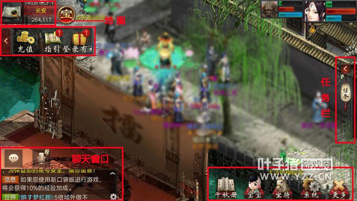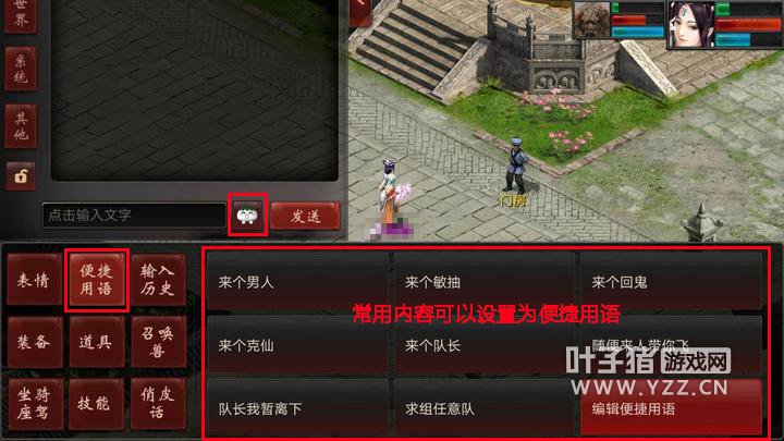 三、新口袋版的基本操作 登录成功看到的游戏界面 1、屏蔽操作 屏蔽界面:双指向外滑动,即可屏蔽界面 屏蔽前屏蔽后(如果传送等被挡住,可以屏蔽后再尝试) 屏蔽玩家:双指向外滑动,界面右下角将出现屏蔽按钮组,点击按钮“玩家”即可屏蔽屏幕中所有玩家 屏蔽摊位:双指向外滑动,界面右下角将出现屏蔽按钮组,点击按钮“摊位”即可屏蔽屏幕中所有摊位 或在系统——游戏设置中选择屏蔽状态 选择屏蔽状态 2、移动及飞行 角色移动:点击目的地,即可向目的地移动。长按并滑动可持续向目的地移动 飞行:手指上滑起飞,手指下滑降落 坐骑:暂不支持 3、频道及聊天 点击打开表情界面,有便捷用语、输入历史、分享装备召唤兽等功能。 快捷用语,可设置经常用的句子 历史发言,点击可以查看和使用最近发送的9句话 4、组队加队 打开屏幕下方的组队功能,可以自己组队,或查看附近的队伍申请加入。 申请加队 或者和PC端相同,在好友界面进行组队 5、交易 对于附近的人,可以点击头像下的“给予”功能,而“交易”功能暂未开启 可以给予给予的界面