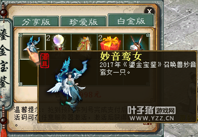 只能说官方真的很吊人胃口,为了方便大家我这里大概整理下经典版鎏金宝鉴包含的内容。 分享版198元:妙音鸾女,鸡驴桌面收纳桶。 珍爱版398元:妙音鸾女,元气丹1个,栖凤(时装),主角手办(祭剑魂、夜溪灵、云中君、青阳使4个主角随机1个),鸡驴桌面收纳桶。 白金版998元:妙音鸾女,元气丹2个,栖凤(时装),主角手办(祭剑魂、夜溪灵、云中君、青阳使4个主角随机1个),鸡驴桌面收纳桶。 可以看到,白金版比真爱版高600元却只多出一个元气丹?感觉不科学啊,然后我再仔细看了下免费版这边的鎏金宝鉴内容,分享版和真爱版内容一致,但是免费版的鎏金宝鉴白金版多了一个变色丹,还多了2个关键性的东西,绝对是结合“妙音鸾女”这个宠物量身打造的!