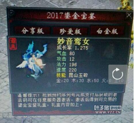 可以看到妙音鸾女的数值并没有爆出,那么玩家的数据是怎么来的呢?仔细看玩家的图,会发现白金版的内容不一样,多了变色丹等。 我想到了免费版,于是到免费版的周年庆使者NPC那查看,果不其然,妙音鸾女的数据出来了。 妙音鸾女