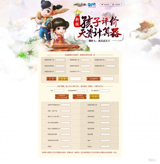 为了让新手更直观的认识到亲密孝心的作用,也为了方便大家更换天资前了解更换后的数值,玩家战且试天下动手做了一个孩子天资评测计算器,为了让广大玩家更方便的预测。