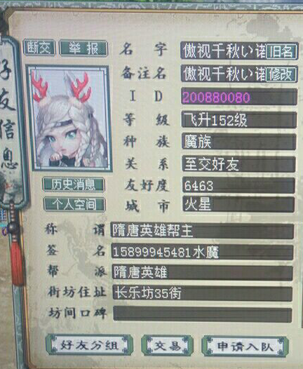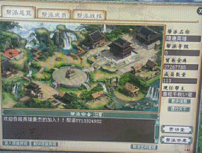 难得一遇的国庆中秋双节同贺,来自云山仙音区的“隋唐英雄”帮的帮主给帮里的兄弟派发节日大礼,浓浓的兄弟情谊让人感动。 服务器:云山仙音 帮派:隋唐英雄 帮主:傲视千秋い诺 副帮主:傲视千秋い问(礼物的提供者) 帮派一览