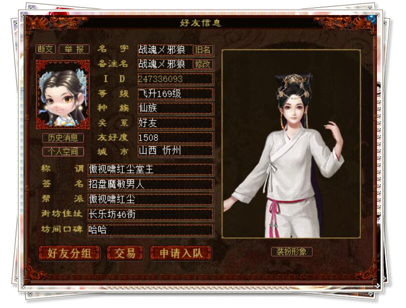 记者莎草为此抵达春暖花开区服务器找到了“傲视啸红尘”帮的管理之一--战魂メ邪狼,邪狼同学以前叫七匹狼☆邪狼,9月份合区后帮派由“缘聚烟柳”改为“傲视啸红尘”。