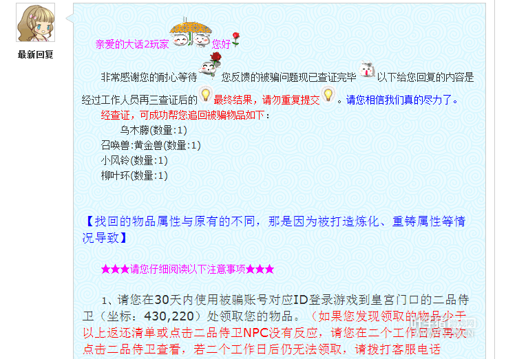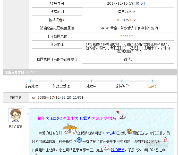 每个行业都会有骗子,游戏里的骗子也是层出不穷,有商人是骗子,也有玩家是骗子,所以不少信誉商人也是哑巴吃黄连有苦难言。 例如下面这位功绩商人,最近就遇到这样一个事,出租功绩宝宝被骗,不但被骗,对方还把终极技能给删了? 骗子这种行为有点匪夷所思了,下面我们看看记录! 骗子骗走了终极宝宝却把终极技能给删了,无法理解这是什么行为,此外不得不说客服还是很给力的,骗子的号最终被封真是大快人心,骗子这是害人害己。 [编辑:米奈]