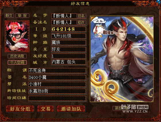 【采访语录】 记者莎草子:你好,能了解下你目前的最高敏是多少? 『断情人』:3405,其实我找记者就是想证明4藕丝5盘子的男魔也能到3400的敏,之前有个上3400的敏他是5介项链。 记者莎草子:在现有的装备基础上,自己感觉是否还有提升的空间? 『断情人』:提升可以但是慢,升级是最稳的。 记者莎草子:你会去追求大家心目中理想中的敏吗? 『断情人』:我心目中的敏达到了 不知道大家理想的敏是多少,现在的基础提升不了多少。 记者莎草子:能问下你的号整体投资是多少吗? 『断情人』:连号2.5W吧,我的号是去年买的 记者莎草子:是离开又回来的玩家? 『断情人』:没有之前在上学没多少钱投资 玩的任务号 现在上班了但是也没多少钱比学生时代能多点,先买了这个号又把原来的号卖了,这个号买的时候传世套没有敏盘子,套装下面也不行,大部分下面是自己洗的,刷了3W+的灵修吧。 记者莎草子:你怎么看现在的敏系? 『断情人』:敏队就两个字 几率,尤其是普通的敏系, 高端的另说。 记者莎草子:说到几率这个是个痛~ 『断情人』:哈哈,确实。 记者莎草子:你打造你这个号有什么心得分享吗? 『断情人』:细节很重要,投入的时间精力多一些 要有耐心搞好细节,敏需要一点的一点的积累。 记者莎草子:慢工出细活 『断情人』:恩 我刷了大半年魔王。 记者莎草子:很多人都刷怕了魔王窟,你呢? 『断情人』:去啊 我只要不加班星期天还回去,那边有好多好友,专门建了一个跨服的群呢,大话现在很少有一边任务一边聊天的队友。 记者莎草子:不错啊 ,刷魔王还刷出一堆朋友 『断情人』:魔族和鬼族尽量多带队经验多 有钱跨服能认识好多不错的朋友,大话现在很少有一边任务一边聊天的队友。 记者莎草子:是啊,现在基本上没人说话~能给点平民玩家敏魔装备搭配的建议吗》 『断情人』:装备的话底子很重要,如果可以的话尽量买成品 毕竟几率这个事不会发生在大多数人身上,多关注阁子和集市可以掏到自己想要的。 记者莎草子:对,搞不好哪会子就发现好东西了 『断情人』:恩 不管玩什么角色 还是什么属性首先要了解他需要什么 而且在自己的能力范围之内再搞,不要嫌麻烦 其实最开心的是你追求自己目标的过程 记者莎草子:你玩很多年了,以前的大话和今天的大话相比最大的变化在哪? 『断情人』:以前挂机的人少 现在都是挂机的,而且好多老玩家都流失。 记者莎草子:主要是现在大家都大了,要带孩子、要陪媳妇~手里再来点事,基本聊天就很难了~ 『断情人』:也是,玩大话的人00后的少 还是属于70、80、90后的回忆,对了可以帮我打个广告吗? 记者莎草子:可以的,说吧。 『断情人』:寻找老友 如果爱下去 和月下独酌 ,如果还下去玩的是男魔后来玩女魔 ,月下独酌是个男鬼,几年前我们一起任务的队友,壮志凌云还是就是星河云海 我叫 花心 。 记者莎草子:好的,希望你早日与老友相聚,这里谢谢你接受我的采访~ 『断情人』:恩,谢谢! 后记: 不管玩什么角色, 还是什么属性首先要了解他需要什么, 在自己的能力范围之内再搞,不要嫌麻烦, 其实最开心的是你追求自己目标的过程。(很赞同断情人的话) 以下分享断情人的人物属性和配置