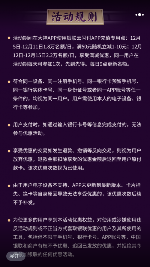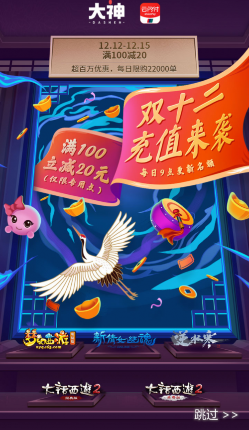 玩游戏,有的人觉得开心就好,有的人则是喜欢精打细算! 而我就是属于后者。 最近游戏里开始预售2020大话时光礼盒: 起初我并不在意,但是想到最近有满减活动,说不准能“免费”获得这个礼盒,便又开始了精打细算之旅! 首先在大神使用银联云闪付APP充值专用点,满100即可减20!相当于80元买了1000点点卡,省了20元。 同一用户在活动期间每天可参加一次,也就是说第二天继续如此操作,只需160元便买到2000点点卡,然后拿去兑换3张月卡,即可获得600点仙玉。 还需190点仙玉才够买时光礼盒,然后因为时光礼盒是限量的,如果担心后面买不到,可以直接兑换仙玉购买。 毕竟小糖果、仙玉瓶子,也能价值140仙玉。而随机抽奖,最差的奖励是千年魂石,换算价值有个25仙玉,所以日历基本算是白送的。 如果你们像我一样,抽到终极丹,那自然就是赚了的: 所以,只需要参加三天满减活动,即可“免费”获得2020大话时光礼盒。 这是一份属于大话2玩家的日历,每天不同的小故事,足足366个,即便是直接购买,我个人是觉得值这个价钱: 网吧五连“坐”: