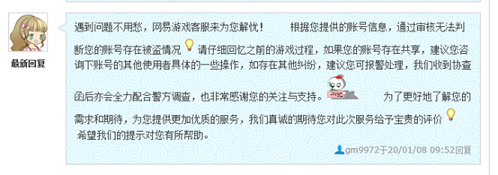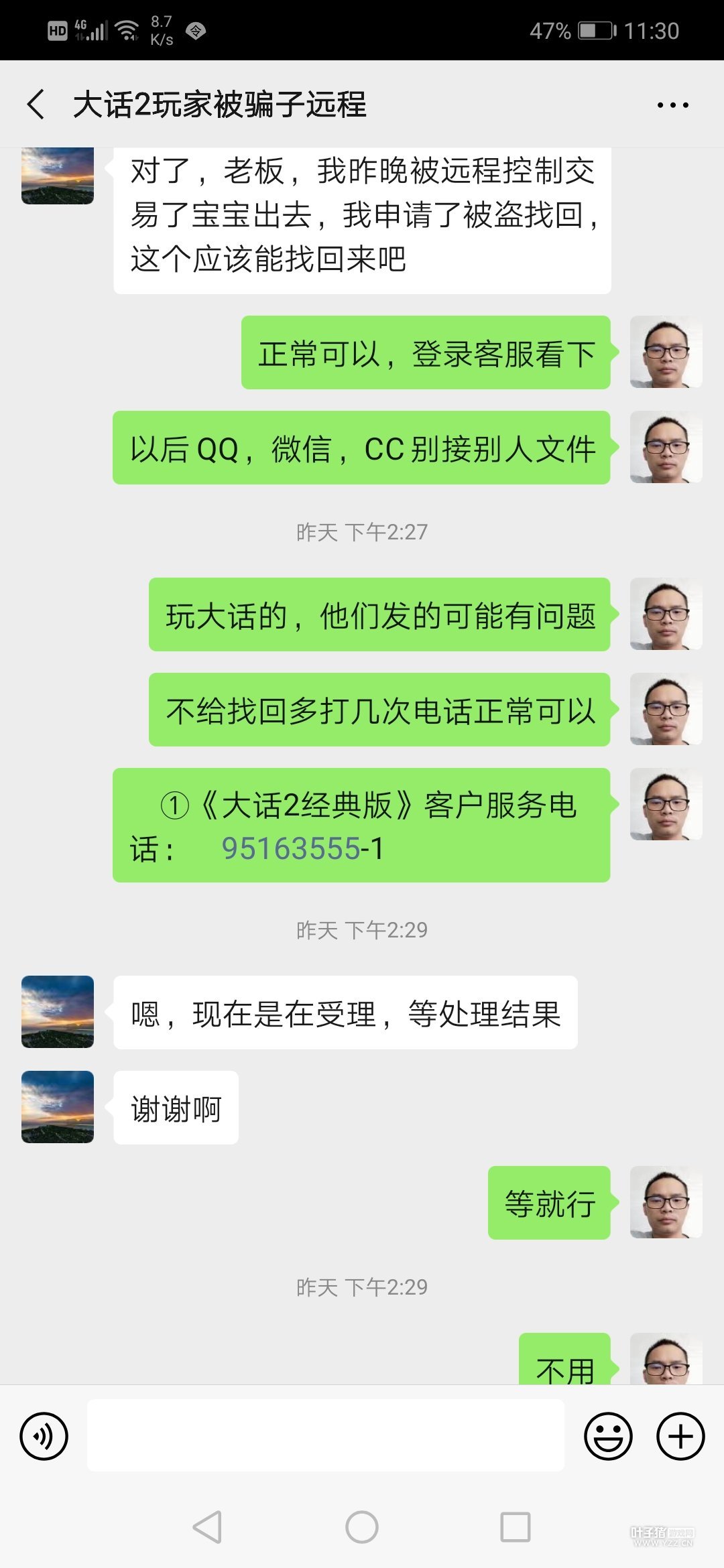 来自天若有情服务器的玩家战且试天下相信许多小伙伴们都认识了,帮助玩家们解决了许多游戏和电脑方面的问题。 今天分享一期玩家电脑被远程控制交易走两只满灵犀孟极和鸟女的事件,损失了近2万块钱哦,客服回复无法判断,玩家都快绝望了,甚至报警了。 在战且试天下的帮助下,最后受骗玩家还是找回来了!在此鸣谢战且试天下给予玩家的帮助及大话2客服为玩家挽回损失,下面一同来了解下详情。 昨日受骗玩家又联系战且试天下,说客服xy2.gm.163.com那申诉了,客服给的回复是无法判断被盗,无法找回。客服回复如下图: |