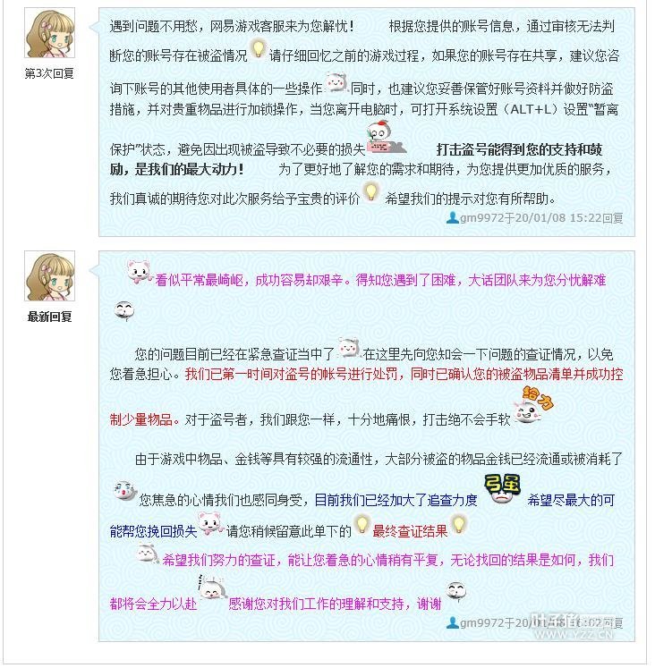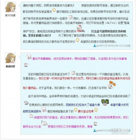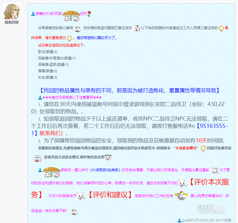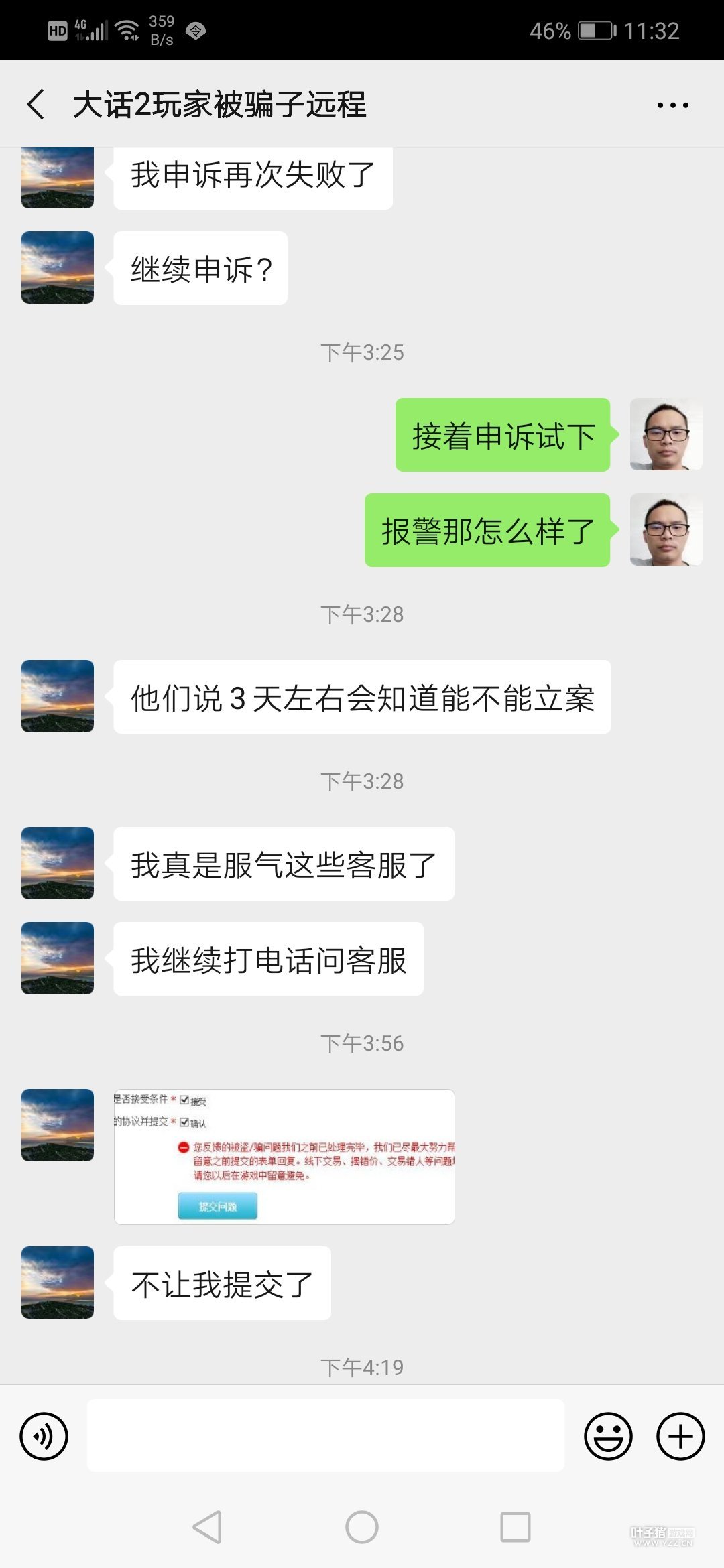来自天若有情服务器的玩家战且试天下相信许多小伙伴们都认识了,帮助玩家们解决了许多游戏和电脑方面的问题。 今天分享一期玩家电脑被远程控制交易走两只满灵犀孟极和鸟女的事件,损失了近2万块钱哦,客服回复无法判断,玩家都快绝望了,甚至报警了。 在战且试天下的帮助下,最后受骗玩家还是找回来了!在此鸣谢战且试天下给予玩家的帮助及大话2客服为玩家挽回损失,下面一同来了解下详情。 昨日受骗玩家又联系战且试天下,说客服xy2.gm.163.com那申诉了,客服给的回复是无法判断被盗,无法找回。客服回复如下图: 战且试天下让受害玩家接着申诉,不过在客服那边不再给申诉了。 受害玩家反馈客服不让提交了 发生这样的情况是否该放弃???受害玩家都快绝望了。 既然不让申诉,战且试天下教受害玩家继续打电话联系客服,打完电话后他在客服平台收到了一个回复,说已经控制了少量物品,如下图: 客服表示已控制了少量物品,有希望了