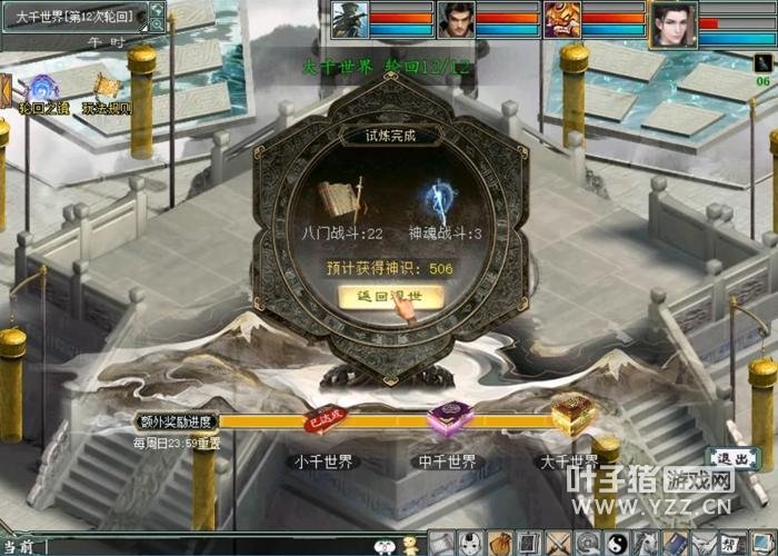 宝宝的选择上,我玩的是大力砍。年给飞轩提速,保证出手混到对面,垂云叟负责输出。当然在抱抱选择上,各位也可以根据自己的喜好做选择,这里可以有很多种变化,包括搭配人物的四系法术,都可以进行调整。 三大世界都通关后,就可以出去领奖励了,奖励物品随机,经验还是蛮多的。且有一个专属的5点“轮回之境”功绩可以拿到! 完成12轮回通关