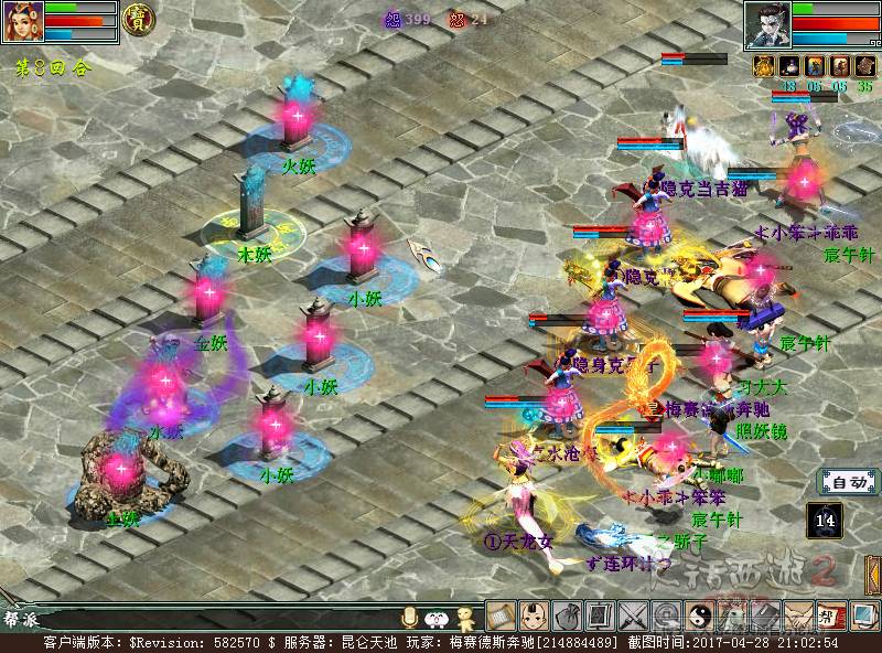 帮派副本一共分为三层,1层是凤巢副本,2层是魔王中殿副本,3层是火云洞副本(全部挑战完毕为结束,当然可以提前离场,提前离场的话出去后兑换的荣誉值应该会降低) 1、开启帮派副本的时候帮派进口会有一个传送门形状的东西,在开启后,会有3分钟等待时间,开启一小时后应该就关闭了。 2、组队进入传送门之后会被传送到凤巢1层,而需要杀的怪在7层,所以不要在1层浪费时间。 3、进入凤巢场景以后,每层的角落会有若干的老大,老二,老三等等小妖,需要点小妖才能传送到下一层, 需要注意的事项是:要选择对的小妖才能传送至下一层,比如你点老大传送到了2层,老大就是正确的传送员, 而其他的小妖就是假的,所以当有谁选择对了,就立即在帮派频道给大家说一声,避免很多队伍一直瞎转。以此类推,直到传送到7层为止。 主怪就在凤巢7层。由于凤巢的主怪没太大难度,抽秒也就结束了,所以也就没有进行截图,不需要太过详细的解释。 1、杀完凤巢的BOSS之后,根据任务栏提示找到小狐狸进入下一场景(魔王中殿),进入以后会看到周围有好几个浪淘沙造型的NPC 2、先找到小狐狸,点小狐狸领取任务,领取完任务以后大家离队 3、离队后,每个人按照任务栏提示,去寻找跟任务栏提示相对的五行八卦。 4、五行相对应的八卦位置 根据所相对的位置去找相对的八卦卦位NPC(浪淘沙)NPC的名字对应的就是八卦卦位。 5、在找完八卦卦位以后,任务栏会提示你已经成功找到卦位,这个时候队长组起队伍然后去找小狐狸拿任务。 6、拿了任务后就会让你去杀怪了。 这个怪其实难度也不算大,就是抗性比较高,提克后秒出来的伤害也相对较低,才7W左右(我队里的仙是15J克水武器)。 主要控制好后2,因为后2会回血。抽秒结束。 1、进入副本后,直接找小狐狸领取任务然后去找到BOSS开杀。 2、这个BOSS略微有些难度,小怪血量是140多W,主怪血不好说,好几百万吧,因为负了抗也得抽半天,杀这个最好带果子。 3、主要控制好所有火人,因为火人会相互拉血,每次必然拉满。 4、主怪控制不住,但是需要杀死,负抗的话主要负主怪跟前2。主怪敏比较高,大概在3000以上吧,连击付混,每回合随机一个目标,建议男鬼有躲闪,男人能保护尽量保护,避免断控制 队形推荐:男人,男鬼,女魔,仙,仙。 为什么推荐这样的队形,主要是因为第二个副本跟第三个副本的控制系法术还是有的,秒的伤害也不算太低,有个盘魔是最好不过。 带男人的理由是第三个副本需要控制好所有火人,抽秒队伍杀起来比较艰难,因为怪抗确实够高,我帮里的一个克火四阶炮提克也就炸8W上下。得慢慢磨死。 三层的怪下来,人物角色159以下的比较高一些,160以上的角色全部下来大概1000W左右经验,召唤兽有3000W左右。 所有怪杀完,点小狐狸离场传送,然后去帮派左上角的帮派副本管理员兑换荣誉值或者是随机物品。 最后祝大家早日点满帮派大成修炼 [编辑:九尾猫]