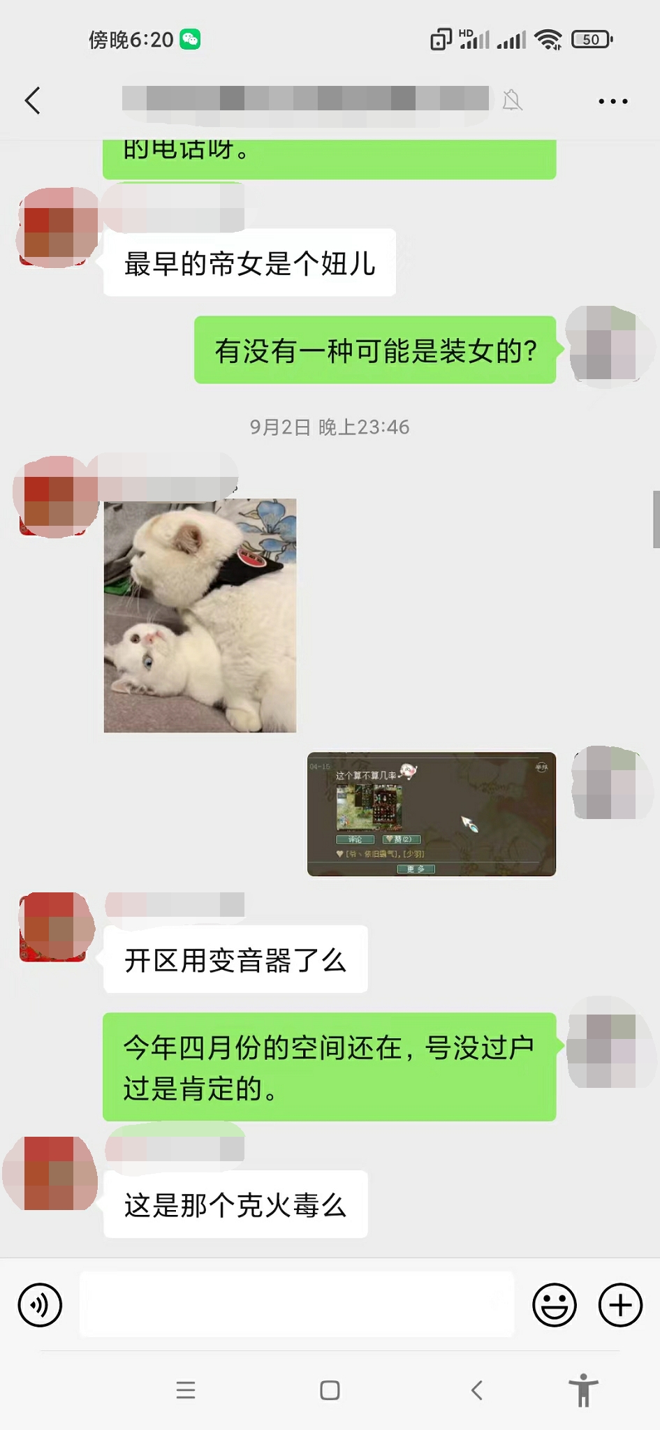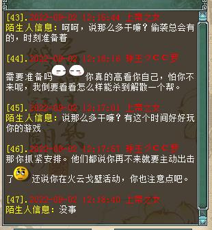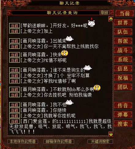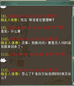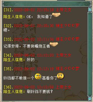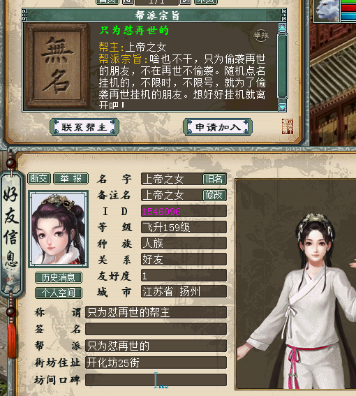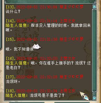 我是【策马江湖】服务器《再世情缘》帮派的现任帮主,我叫球王CC罗,今天要给大家分享一桩奇葩事件! 9月1号当天,一个号称《再世情缘》帮派创始人的玩家,前来和我索要帮派,还扬言要是不给他帮派,就偷袭全帮人员,直到帮派解散??? 我在“万般惶恐”之下,火速和帮里的管理人员通了气。大家齐心协力,有的在天上查位置,有的来长安城东等待对方的进攻,有的在查找这个人的详细资料......大家同仇敌忾,忙得不亦乐乎,整个过程中,除了要感谢全体兄弟的帮忙外,我还要特别提一下这位名叫“上帝之女”的玩家,如果不是他,这场热闹无比的大型事件又怎么会产生呢? 就在我认为这是一个“逗比”的时候,我们帮派群的群友里,却有人表示认识这个人,而且更是爆出了猛料。由于内容实在让人哭笑不得,所以请原谅我必须给爆料人打码。 并且,他还创建了一个新帮派,名叫《只为怼再世的》,据我了解,现在他的帮里,只有他一人...... 我们的《再世情缘》帮派,目前全区排名第2,这是全帮人员共同努力的结果。就连我这个现任帮主,帮派里的大小事件也需要和大伙儿商量着来...而这个“上帝之女”到底是什么目的,我真是完全搞不懂啊! 通过上面的聊天记录,我最后想给这个人总结一下:他很可能是个“逗比”,纯粹就是来逗我们开心的! 最后,请大家警惕“女扮男装”或者“女装大佬”,防止被骗财骗色骗感情,其实被骗也就算了,但是要回想起过程来,难免会感到下身一紧吧?所以,兄弟们啊,一定要抓牢裤腰带,意志力要坚定啊! 谨以此文,献给所有大话老铁,希望在这个炎炎夏日中,此文能让您感受到“一阵凉意”,祝大家天天开心,笑口常开! [编辑:叶子猪小秘书]
