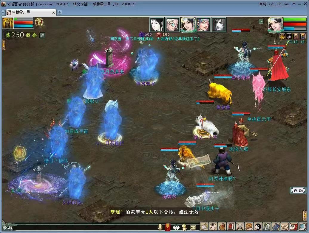 在新区【情义大话】当中,两个帮派的主力队伍相遇后,竟足足打了250回合,如此震撼场面你可见过? 投稿的玩家表示,因为对面是主力队伍,就想着拖他们一下,没成想直接拖了250回合...从下午帮战开始,直接拖到凌晨12点多! 值得一提的是,对方队伍中的玩家,都是区里排名前几位的大神级人物: 而且我方帮主也非常讲究,帮战结束后,帮主直接传音喊话几位打到12:30的帮众,每位帮众奖励补天一块(新区补天大概10元钱左右一块)。 这才是血性男儿该有的样子,不服就干!不过是不是帮战的回合数上限也要调整一下呢,这250回合,真的有点伤肝啊...... [编辑:纳兰德骑士]