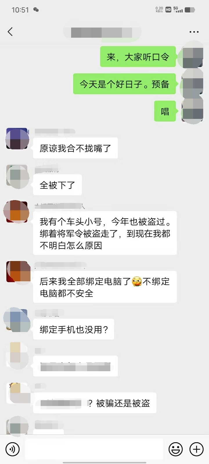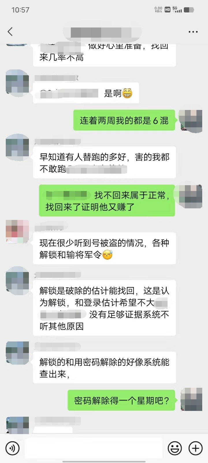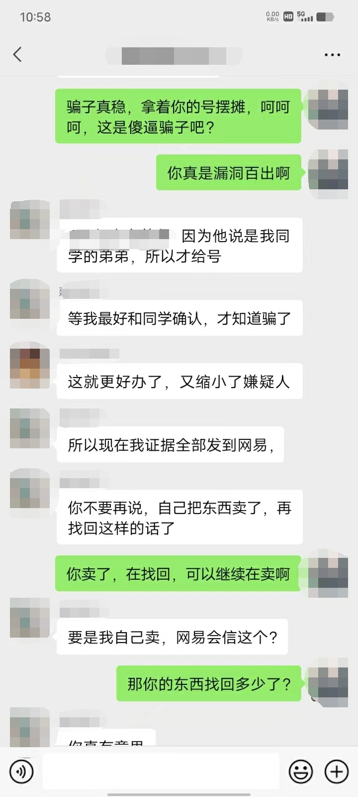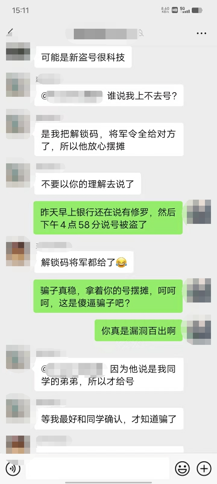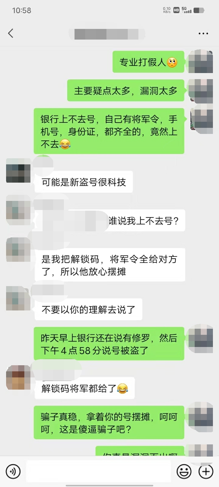 大家好,我是一名大话玩家群的群主,具体服务器和帮派先不透露了,主要想跟大家分享一件刚刚发生的奇葩事。 前几天,我群里有个玩家说自己号被盗了。他说明原因后,我总觉得哪里不对,事情经过是这样的: 一五开玩家在帮派群里说自己号被同学盗了,然后说要申请找回。他一会说骗子是冒充他同学,一会又说这个人其实是同学的弟弟;而且号被盗后,他的号还在摆摊卖东西。并且他在陈述这件事的时候,看起来平静得很,也并没有着急或者骂人,于是我就怀疑他有其他目的...... 下面给大家上聊天记录,大家感觉一下我的怀疑是否有道理: 我给出的结论就是:他是想通过他的现实朋友上他的游戏号,把东西都卖出,然后再由他本人上号申诉被盗追回,这样他就是最大的收益者。 之所以在群里说号被盗,是想拿这个作为铺垫,到最后那些买过他东西的人物品如果被找回,肯定会满世界刷他。这个时候他在群里的聊天记录就能发挥作用——让帮里人相信,他的号确实是被骗子盗号。 如此一来,他就是最大的受益者了,不用承担找回后的人设崩塌,还能多赚5个号的物资...... 当然,这件事情目前还只是我个人的怀疑。而我也和其他玩家私下沟通过,他们也持有相同的态度,同样怀疑是他“贼喊捉贼”。分享这件事的背景,也是源于现在的骗子大行其道,尤其是线下交易的玩家,交易完就删好友玩失踪的大有人在。前一天还你侬我侬,朋友兄弟,第二天直接人间蒸发,只留下受骗者的谩骂指责和刷屏爆料。 希望大家在交易时多一分清醒,能走阁子的绝对不要线下。而且角色要绑定电脑,高级解锁码不要轻易告诉其他人。保护好自己的角色,给自己更好的游戏体验吧! [编辑:纳兰德骑士]