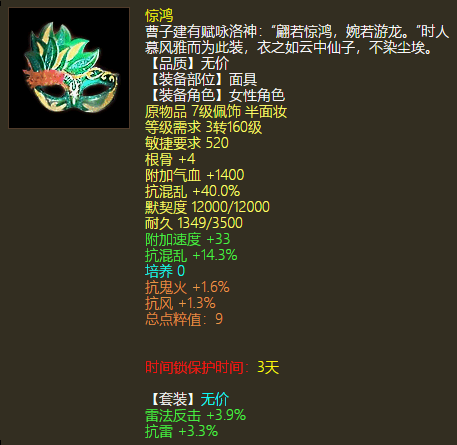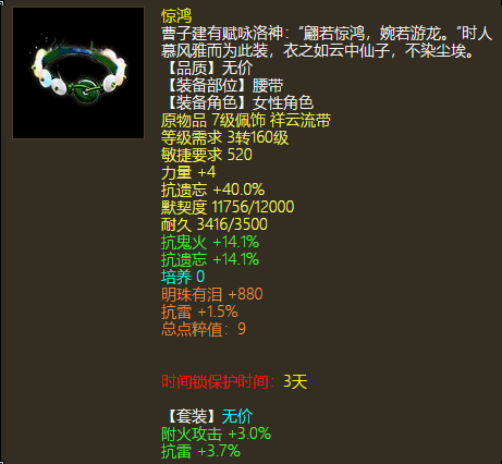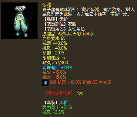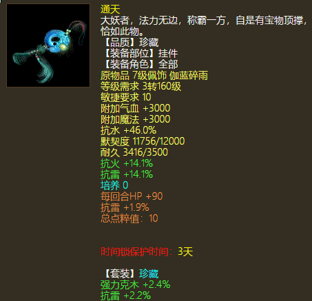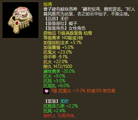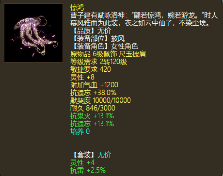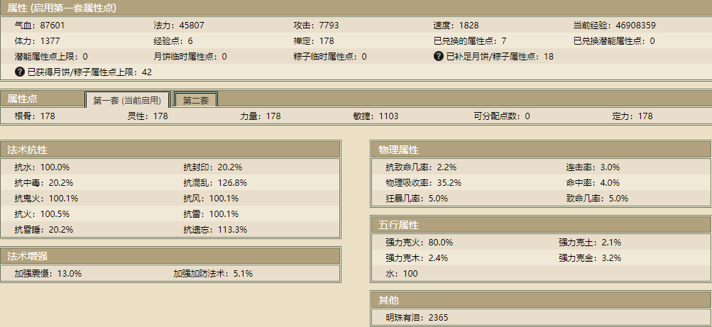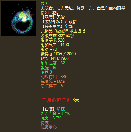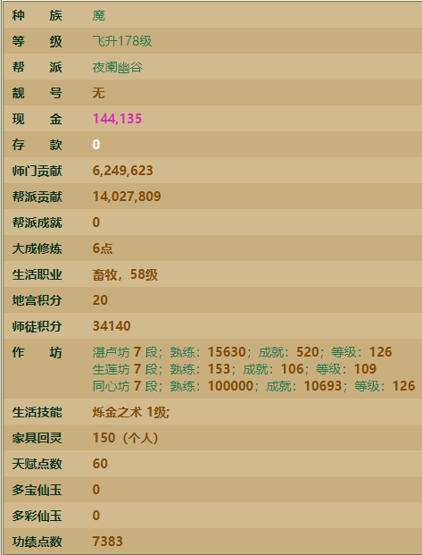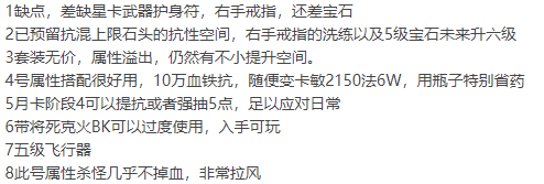 今天逛交易集市论坛,看到一个非常不错的7抗小女魔。底子过于,搭配出来的抗性也比较亮眼,同时卖家还声明了自己的优缺点,可谓是良心大大滴~ 下面我们就来欣赏下这个七抗小女魔的具体情况把,先来看属性图: 图中展示的是站街状态的抗性,抗风雷水火100+,抗混126+,抗遗忘113+,抗鬼火100。 这样的7抗属性,做任务是绰绰有余了,但也不是没有缺点,我们看看号主自己怎么说: 本人对号的评价,应该说很中肯了,他也给出了入手后的建议和此号的优势,算是很良心的自评! 不过,咱们还是要亲眼看一看具体是怎么搭配的,下面上硬件: 套装是无价和珍藏混搭,都进行了细节上的处理;佩饰的属性点上显然是没有精挑细选,虽然无伤大雅,但是强迫症看着难受;实际情况的确如玩家所说,后期配上星卡武器和护身符就可以玩了。 既然咱们是来看热闹的,这里也想提点个人建议——这个号如果是拿到手玩,配个单抽星卡,一把普通武器或者神兵,再来个忽视抽护身符,就足够了。如果想要精进点,护身符用四抗抗抽法的,星卡单抽带个抗性或者速度敏捷都可以,有条件上双抽更完美。 如果正在看贴的各位,是来学怎么搭配一个日常多抗女魔的,我觉得上面的装备搭配方案就挺合适,当然光有装备搭配也不够,得看看它的底子怎么样。 看完属性,做下总结,先说优点: 1、60天赋,以后有机会成为一个好满抽; 2、7383功绩,直接带8级护身符; 3、3个7段作坊,而且是武器项链和鞋子; 4、5级飞行器,不担心杀妖抢星落人之后; 5、1,3,6坐骑点化全满,6坐骑为人6坐骑,任务神器; 再说缺点: 生活职业不满,小妖产出效益低(不要小看这个收益,很可观); 等级178,给人不上不下的感觉; 日常三星魂只有两个,缺个天罡激活“甘霖瑞雪”; 月饼点42(日常其实不是很重要); 同样也是坐骑,2、4缺筋骨,7坐骑是魔7,且技能没有重选,熟练也不满; 只有一修,法门不高; 老孩子有1枚,养的不够好,强迫症不能接受,但是日常凑合用。 要说挑毛病,老铁们肯定是能说得比我还全面。能不能入手,关键还是看价格,下面是他摆出的价格。 就算是几万几十万的号,我想大家也是能挑出问题的,但是如果价格合适,想必所有的问题都不是问题了,对吗? 不知老铁们觉得他摆出的这个价格合适吗?如果让你看的话,你会觉得这个号值多少呢? [编辑:纳兰德骑士]