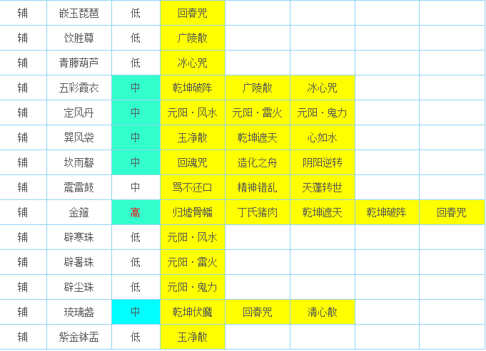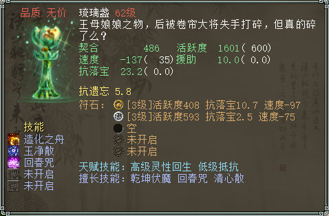 大家好我是野猪哥!今天想和大家聊聊辅助灵宝那些事,希望帮助大家更好地运用此类灵宝,在日常、PK当中也能更加游刃有余! 在日常任务时,玩家们更多会携宸午针、乾元镜、如意金钩等攻击类灵宝,而很多玩家对辅助类灵宝的认识,可能仅仅只来源于各类高端赛事吧? 其实辅助类灵宝对副本挑战方面的帮助也是非常大的,只要合理搭配灵宝技能,就一定能让咱们的战斗手段变得多样化,也让战斗过程变得事半功倍! 下面就先从灵宝本身的种类说起,在辅助灵宝当中,最强的一类就当属“金箍”了,下面是我在藏宝阁搜到的PK专用金箍,这枚灵宝价值非常昂贵,这里只作欣赏参考: 以此灵宝为例就可以看出,不同的灵宝种类将决定擅长技能的强弱。攻击类灵宝的擅长技能为增加攻击单位。而辅助类灵宝的擅长技能,则是从数值强弱来区分的。 例如回魂咒技能,在擅长技能的情况下,重生后恢复的血量提升为50%。 清心散技能,擅长技能情况下接触控制的几率多增加5%。 元阳鬼力技能,擅长技能情况下减免伤害从75%提高到85%。 造化之舟技能,在擅长情况下,释放出来的单位将多回复30%气血。 阴阳逆转技能,在基础承伤次数上增加1次承伤。 余下的各类技能就不一一介绍了,感兴趣的兄弟可以看看下表的辅助类技能介绍,多增加点对辅助类技能的认识也是好的。 下表中的高、中、低,指的是灵宝获取难度。如获取难度高的金箍,只可以通过灵宝碎片合成,其余的则可以在大雁塔、秘境等等副本中用积分兑换。 通常来说,选择带擅长技能的灵宝才是最优选择。不过如果一枚灵宝领悟了一个不错的非擅长技能,其实也无伤大雅,如下面这枚琉璃盏: 如果刚好是领悟了擅长技能,那肯定更加值得开心了,如下面这枚坎雨磬: 说到这里,肯定有小伙伴会问,那么我们怎么选灵宝种类和擅长技能呢? 拿上图中负敏带造化之舟的琉璃盏举例,咱们假定一个战斗状态,回合结束时,我方3个单位被控制且是站立状态。那么如果琉璃盏的造化之舟技能触发,就会将这三个单位收进灵宝,注意是高于灵宝速度的单位,这就是为什么做成负敏。然后这回合结束马上放出并解除受控制状态,擅长技能还可以回复30%气血。那么从下回合开始,这三个单位就几乎是最佳状态了! 下面推荐几个比较实用的冷门灵宝给大家,不光实用,而且打造起来也真的超便宜。 《定风丹》,擅长技能“元阳风水”,平常风法水法的怪居多,使用起来效果很赞,大家都知道抗仙法的重要性,那么此灵宝技能发动的时候,就相当于抗仙法85%了。 《琉璃盏》,擅长技能“清心散”,几率解除被控所有状态(包括金箍)。对于被控单位,现在除了吃解药、套装技能能解控,再就是此类灵宝技能了,强不强大只有用过才知道。 《坎雨馨》 ,擅长技能“回魂咒”、“造化之舟”。(回魂咒就相当于龙的甘霖,造化之舟是把己方单位收起来保护和解控、回血) 其他技能大家看看技能介绍就好,而且队伍中不用所有人都带辅助类灵宝,有1-2人携带,很可能在你刚好需要的时候,它刚好发动,那就是奇效了! 下面再简单介绍一下辅助类灵宝的天赋技能怎么选。 我个人认为,如果只是用来下副本,打造成本尽量在100块以下。就是上图的琉璃盏和坎雨磬之类的灵宝,带1-2个自己想要的辅助技能即可,符石孔2-3,技能孔3就足够用。 如果是对天赋技能有追求,那么下面两种搭配是最优选,当然价格也更贵一些。 招魂+挣扎,招魂是灵宝发动后,死亡单位复活。低级挣扎是人物倒地 ,触发技能几率33%,高级挣扎是50%。 低级挣扎+高级回灵。高级回灵是除招魂外的另一个复活技能(区别于擅长技能),高级回灵是只要灵宝发动,就给人物回复血量+1,法值+3000。低级回灵不回复血量,只回复法量,这里大家要注意区分。 好了,今天就先分享到这里,希望大家看完后,在挑战高难度副本时能更轻松一些吧!如果大家有好的打造方法,也可以留言分享,咱们下期再见! [编辑:纳兰德骑士]