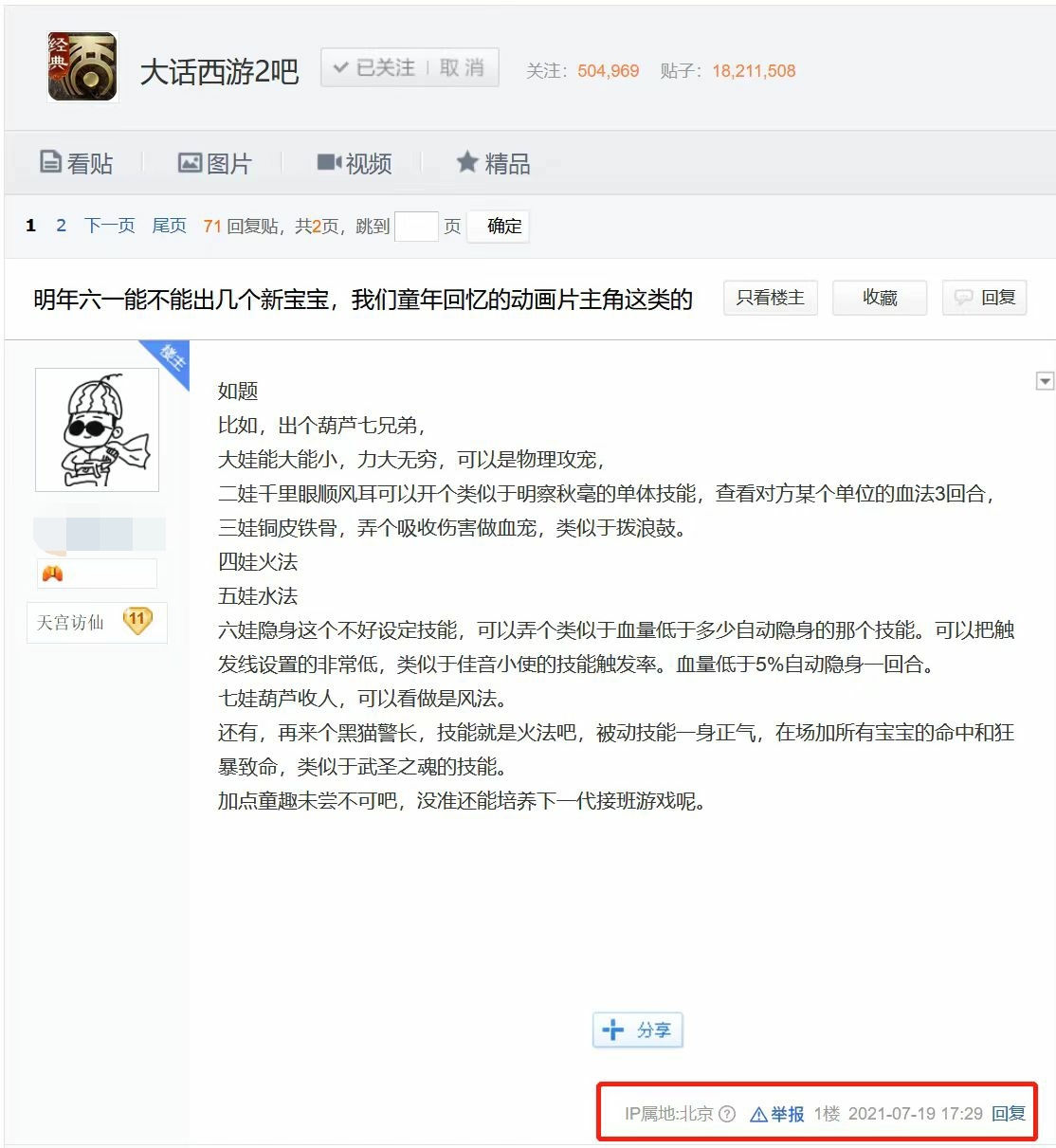 葫芦娃登陆大话?有老铁2021年就神预测到啦!摆价88888的二转极品角色,看看什么样!心猿又点出问号,二手车首付有着落了!交流群惊现逻辑大师,在线分析葫芦娃前缘,竟然跟孙悟空和七仙女有关系!新出的一条混项链,大家看看值多少米! 今天的大话新鲜事栏目相当精彩,速速来欣赏吧! 一、原来,两年前就有人预测过葫芦娃 2021年,贴吧惊现神预测,果然大话玩家多人才! 问题来了,既然葫芦娃在两年后得以实现,下一个联动的召唤兽会不会是黑猫警长呢? 二、2转角色摆价88888 二转大神惊现藏宝阁,养号界的NO.1非他莫属!5个极品孩子,时装特效奇多,星盘满,功绩一万多! 凭2转状态,把号养到如此之神,全网可有与之匹敌者否? 三、心猿出问号,二手车到手! 老铁想买一辆二手车,这只心猿算了却他一桩心愿! 现在藏宝阁里摆着的问号心猿在7万+,不考虑4座以上车,这个价格能买个什么样的二手车? 四、葫芦娃的前世今生 交流群惊现逻辑帝,和大家分享葫芦娃的前世今生! 大家有没有觉得...他说的貌似还有点道理呢? 五、新出混项链 底子蓝字忽视混0.7,炼化忽视混4、强混3的神项链出炉! 总忽视混4.7,强混3,这样的项链值多少米,大家来估个价吧! 今天的大话新鲜事就到这里了,感谢虎、诚实可靠小郎君、KD汪、哈莉奎茵、三华李种植户等玩家的热心投稿。小伙伴们如果在游戏内外碰见任何有意思的事情,都可以给我们投稿哦! 最后,有想在7月冲新服的兄弟,欢迎加入“七月新服交流群”,提前和大家组队、交流新服心得,群内不定时还有福利发放哦!