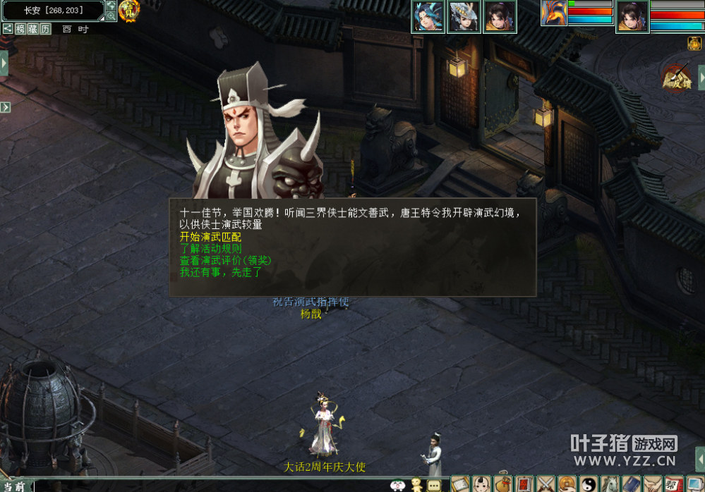 每日14:00-16:00,19:00-21:00,3人以上组队前往长安(265,200)寻找杨戬即可参加演武。