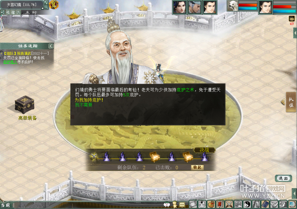 最后阶段全地图将开启天罚,少侠需寻找地图中的庇护老人,寻求庇护。(每支队伍只可庇护5次)