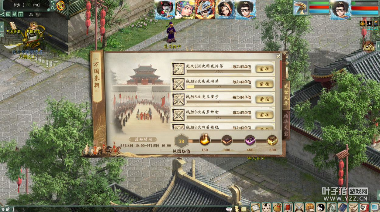 1.参与万国来朝各个玩法可获得风华值,风华值达到150、300、450、600时能获得奖励。