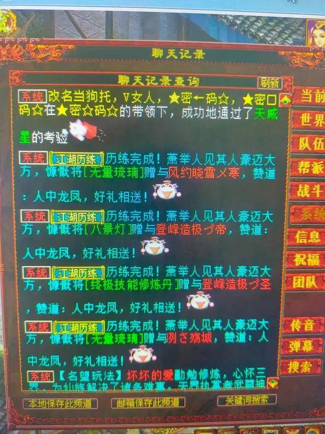 价值12万的冰项链已成功售出!集齐大雁塔高级符咒,竟换出最贵神兽?马上鸿运得龙马,然后真的得到鎏金宝鉴!帮派赏功堂抽到一等勋赏册,一发入魂开出神兵!五开跑300环,这次表哥不会让我哭了吧? 老铁们好!今天的大话新鲜事栏目准时奉上,一起来欣赏其中的精彩内容吧! 一、忽视冰项链12万售出,真的不算贵? 藏宝阁中一条售价12.1W的项链,近日被某位神秘大佬直接收走,下面先来看看属性情况! 被大佬买走 项链全貌 抗封印36.4、蓝字忽视1.1、炼化忽视4,还带躲闪19,感觉是为后置冰人专门设计的?而据一些男人族玩家说,这价格算下来应该不贵,因为这属性确实可遇不可求! 二、集齐高级符咒,换出最贵神兽? 集齐大雁塔高级符咒,不仅需要经年累月的努力,还需要一定的运气加成,而今天这位老铁不仅集齐了,还换出了最贵的神兽! 兑换情况 这是位来自雾隐云居的玩家,五常神兽中最值钱的浪淘沙到手,大家帮算算这波赚多少? 三、马上鸿运得龙马,真的来了! 世界频道发言“马上鸿运得龙马”,他跟着喊了一嗓子,然后真的得到鎏金宝鉴分享版了! 系统消息 第一视角 赶紧来吸吸欧皇之气,小编也喊了啊:“马上鸿运得龙马”! 四、一等勋赏册,开出破物理神兵! 打完帮战后在赏功堂抽奖,而后抽到一等勋赏册,一发入魂开出破物理神兵! 抽到一等勋赏册 破物理宣花斧 是把狂暴破物理斧子,今晚本来准备吃鸡的,这下直接换火锅吧! 五、五开300环,这次不会哭了吧? 谁家孩子天天哭?我就不信了!这位兄弟又一次五开跑完300环,希望这周的运气不会差! 系统消息 最差的是终极丹,最好的是神兵八景灯,太牛了,这就是传说中的厚积薄发吗? 今天的大话新鲜事就到这里了,感谢大黄蜂、杨帆、忆。、如歌、默认值等玩家们的热心投稿,小伙伴们如果在游戏内外碰见任何有意思的事情,都可以给我们投稿哦! [编辑:oljcw]