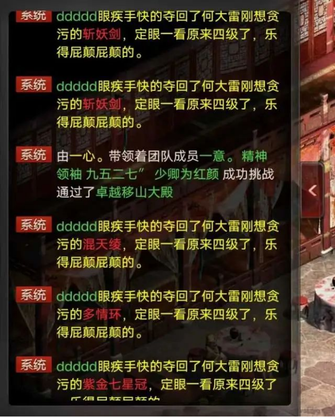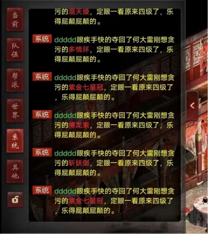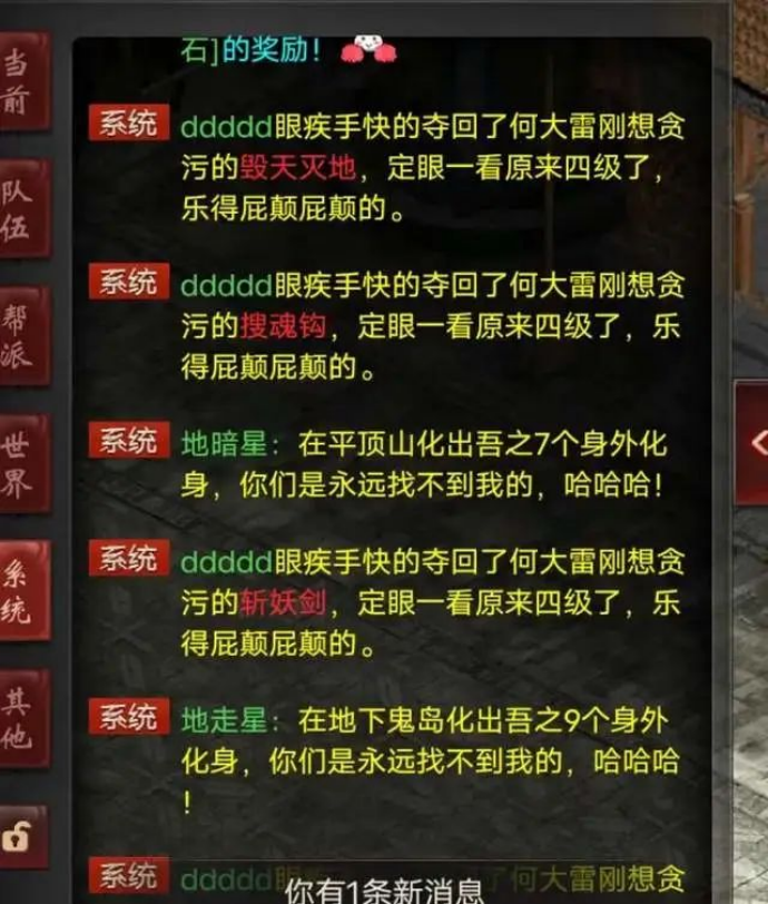 某区惊现刷屏式的冲神兵消息,当年神兵帝再现江湖!藏宝阁价值5000块的护身符被点,愣是没看出亮点在哪?帮派抢红包,前一个手法刁钻,后来者运气最佳!星爷电影联动玩法,又有小伙伴获得不错奖励!混武器炼化,号主忍不住发世界,结果大家却笑了? 兄弟们好!今天的大话新鲜事栏目准时奉上,一起来欣赏其中的精彩内容吧! 一、刷屏升级神兵,这是哪位大佬? 好久不见的大场面!夜半时分,某区出现疯狂冲神兵的消息,因为这些神兵竟全都上四了,区里的兄弟更是大呼666! 系统消息 又一波上四 继续上四 据说这还不算完,过了一阵子又冲上了几件四级,这到底是冲了多少件神兵呢?大家不妨猜猜,看不到的背后又碎了多少件? 二、五千元的护身符,亮点在哪? 藏宝阁中有人花5000元购买了一枚护身符,打开一看,这东西也没什么亮点啊,凭什么卖5000呢? 护身符全貌 百思不得其解,兄弟们帮忙看看,它值钱的点到底在哪,莫非买家是看上品质了? 三、帮派抢红包,手速快不一定是好事! 帮派抢红包,两位帮众一对比结果,还真是一个天一个地啊,这怎么能差出几百倍呢? 系统消息 看来手速快的不一定抢得多,第二位老铁手气真好,总共2000万的红包,他一人就抢了一半还多! 四、周星驰系列电影活动,有人喜获贵重奖励! “星驰神往”活动全服上线,有位小伙伴获得了非常给力的奖励,一时间羡煞旁人! 黄金紧箍咒戒指 周星驰签名海报 这奖励看得小编都流口水了,赶紧上号做任务去...各位小伙伴你们都得什么好奖励了,欢迎来投稿哦! 五、炼出碧海青天,莫非武器要毕业? 玩家给自己的武器炼化,不料练出“碧海青天”发光效果,难道这武器要毕业了吗? 武器全貌 混武器底子,出现忽视遗忘+10、加强封印+11,号主都忍不住发世界给大家同乐乐,这也太歪了啊兄弟! 今天的大话新鲜事就到这里了,感谢星哥、等风的风筝、韩景乐、乱花渐入、李佳炜等玩家们的热心投稿,小伙伴们如果在游戏内外碰见任何有意思的事情,都可以给我们投稿哦! [编辑:94894JFD]
