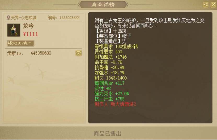 三转男人爆血展示,但似乎还不是他的极限?神秘大佬回归,直接拿下两只化无白泽!心猿灵光一闪,意味着十万元到手了!1111元购买的帽子,822块挂藏宝阁无人问津?听人劝,吃饱饭,一本灵兽要诀的几率! 老铁们好!今天的大话新鲜事栏目准时奉上,一起来欣赏其中的精彩内容吧! 一、爆血三转血人求超越! 玩家投稿称,这枚三转男人号居然有八十万血?而这还不是他在血量方面的极限,咱们先来看看他的属性展示吧! 属性展示 全根骨加点,ID也非常亮眼,整整八十万的血量啊,玩小号的兄弟有能超越他的吗? 二、神秘大佬购买两只化无白泽! 最新消息,近段时间回归的神秘大佬,又入手了两只化无白泽,成交价突破200万元! 化无白泽 第二只化无白泽 恭喜大佬喜提化无白泽,感觉离大赛夺冠又进一步啦! 三、灵光一闪,十万到手? 某服心猿灵光一闪,直接领悟终极技能,这妥妥地十万块到手了呀,一起来欣赏! 系统消息 心猿领悟终极技能“赫赫神威”,成圣近在眼前,看来江湖上又要多一只圣猿神兽了! 四、哪个冤大头会买这帽子? 有玩家花1111元购买了一顶高装龙吟,一看属性也没有特别之处啊,莫非是喝多了吗?一起来看看怎么回事! 购买消息 帽子全貌 寄售价格 十四级帽子,强水18.7,抗昏睡36.8,炼化克水27、灵性8,号主随后又以822元的价格寄售藏宝阁,然而却无人问津...... 五、听人劝,吃饱饭,吃本灵兽笑翻天! 听人劝,吃饱饭,老铁仅仅开了一本灵兽要诀,就被鸡驴大神当头眷顾了,一起来看看他吃出了什么技能! 购买信息 牛啊,直接吃出神出鬼没,在吃技能之前,他还听朋友提议给宝宝改了个名字,看来听人劝真的非常有必要! 今天的大话新鲜事就到这里了,感谢无名大兄弟、xy2燕南天、虎头怪我咯。、童年回忆、李大胖等玩家们的热心投稿,小伙伴们如果在游戏内外碰见任何有意思的事情,都可以给我们投稿哦! [编辑:658dhuw]