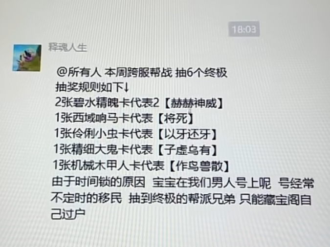 一位二转狂男,物资堪称全服至强!着就十分强悍!一双超越藕丝的十六级鞋子,抗性也非常亮眼!1级灵宝能卖到近3万元,很离谱啊!大君帮派赏功堂的这几张变身卡,听说很不简单?刚洗出青龙星阵的星符,来个冰人看看! 老铁们好!今天的大话新鲜事栏目准时奉上,一起来欣赏其中的精彩内容吧! 一、二转男人展示,堪称全服至强! 这位二转男人的物资实在太给力了,他手拿双特技六阶武器,脚踏六级高召藕丝,整个二转界应该无出其右! 人物等级 6阶双特技混武器 6级高招藕丝 6阶混武器,双特技为无级别、正骨混;6级藕丝带高召,光这两件装备的价值就破百万了吧? 二、太子脚上所穿神鞋,属性超越藕丝! 玩家“七彩太子”展示出自己的十六级鞋子,整体速度、抗性等属性都极为亮眼,属于可遇不可求的神物,一起来欣赏! 属性展示 十六级“踏莎”,底子抗混16.9、敏捷45,炼化敏捷73、抗封印6、抗混乱7,总加敏234,抗混23.9,这绝不是一双普通的十六级鞋子,兄弟们觉得它价值多少呢? 三、1级灵宝卖3万元? 玩家在大雁塔兑换出高级灵宝“金击子”,藏宝阁一查,售价竟然将近3万块? 灵宝展示 抗落宝15的成交价2.8万 一级金击子,天赋低级挣扎+高级回灵,初值抗落宝15,卖出了28888元高价;而今天的这枚,天赋相同,初值落宝8.5,大家觉得能卖多少? 四、大君帮派再发福利! 红颜知己“君为兄弟而战”帮派又为兄弟姐妹们发福利啦,这次据说是在赏功堂里放了几张变身卡,凡是抽到的皆可获得终极一枚! 帮派抽6个终极 好家伙,卷起来了!之前众志成城的盖世无双帮派,为了激励大家帮战,在赏功堂抽五常神兽,而大君帮派居然连抽6个终极,真是羡煞旁人! 五、这枚青龙星阵有点纠结? 玩家洗出一张青龙星符,神通是双忽视冰的,但宫位看着还不错,一起来欣赏! 星卡全貌 十四级地魁星卡,满资质加双忽视冰,青龙星阵,宫位方面,号主觉得无论是PK还是任务,似乎都有点纠结,大家觉得如何呢? 今天的大话新鲜事就到这里了,感谢大男孩、七彩飞扬、Gargamel、孑然眷恋、吴剑颂等玩家们的热心投稿,小伙伴们如果在游戏内外碰见任何有意思的事情,都可以给我们投稿哦! [编辑:19djie]
