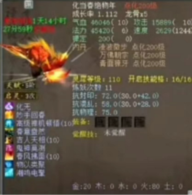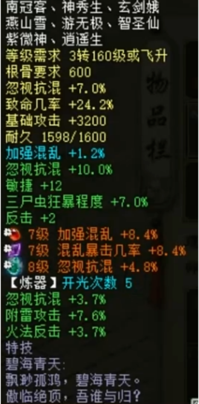 天花板中的天花板,全服第一男魔武器!神豪慕小冉近日又有大动作,一下购买三只化无年!绝版抗中毒挂件,藏宝阁摆价1万元!不到5分钟的时间,他连续洗出两个青龙星阵!十六级混武器终于毕业,还带蓝字? 兄弟们好!今天的大话新鲜事栏目准时奉上,一起来欣赏其中的精彩内容吧! 一、天花板级男魔武器! 天花板中的天花板,全服第一男魔武器,不接受反驳!兄弟们一起来欣赏这把武器的属性! 武器展示 6阶裂风,蓝字速度9满值,炼器三敏速叠加12,算极限满值,此前那把底子一样的武器,但是炼器差1点速度,这把武器估计没个20万下不来吧? 二、神豪入手三只化无年! 神豪慕小冉近日又有大动作,一口气购买三只化无年,这在任何城市买套房都够了吧...... 第一只化无年 第二只化无年 第三只 据说为了针对化无砍战术,改大力的宝宝怎么都快不过年,因为天下武功唯快不破,兵临城下还敢出手嘛? 三、抗毒装备要涨价? 绝版抗中毒挂件,藏宝阁摆价1万元,印象中抗毒装备没这么贵啊,一起来看看怎么回事? 寄售信息 抗毒42默契挂件,下面三抗人法冰混睡,藏宝阁居然摆价1万元,看来就是女人毒伤崛起的关系,有这类装备的要注意了,千万别当便宜货卖了! 四、连续洗出两枚青龙星阵! 来自永生所爱的玩家,用了不到5分钟的时间,连续洗出两枚青龙星阵,妥妥的人生高光时刻! 系统消息 这两枚青龙还是在半夜两点洗出来的,看来“凌晨出宝贝”的说法不无道理! 五、十六级混武器迎来毕业! 兄弟给自己的十六级混武器炼化,历时良久,今日终于迎来毕业,而且蓝字还带强混! 武器展示 底子忽视混7,蓝字加强混1.2,炼化忽视混10、敏捷12,炼器忽视混3.7,相当的给力,恭喜老铁! 今天的大话新鲜事就到这里了,感谢笑忘书、浪荡不羁小青年、杨小路、愤怒的铁锤、李大胖等玩家们的热心投稿,小伙伴们如果在游戏内外碰见任何有意思的事情,都可以给我们投稿哦! [编辑:10d9jui]