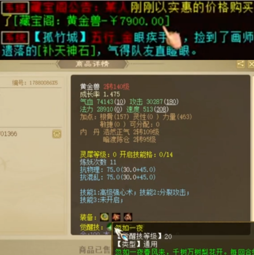 盖子老板再出手,据说已经是第九次了!宝象国换的灵宝咋了,不值钱吗?标价近八千元的黄金兽,主卖觉醒技吗?一把五级仙法武器的炼化,炼器很讨喜!新服出的狐小妖,公示期直接被秒! 老铁们好!今天的大话新鲜事栏目准时奉上,一起来欣赏其中的精彩内容吧! 一、盖总再出手,第九次重修第一神兽! 盖子老板近日再度出手,给自己的神兽年重修终极技能,据说这已经是第九次了,整体打造的价格都超过自身价值了吧?咱们看看这次能心想事成吗? 重修终极 子虚神兽年 最后修出子虚乌有终极,这种神兽重修一次具体需要花费多少呢?有了解的小伙伴还请评论区留言! 二、宝象国的灵宝不值钱? 都说宝象国换的灵宝不值钱?这都是什么子虚乌有的传闻,来来来,这位兄弟随手一换就是好东西! 灵宝全貌 宝象国杂货店随机换的高级灵宝“巽风袋”,天赋技能:低级挣扎、招魂,这少说也值上千块吧?兄弟们别信不靠谱的传言,该换还是换起来! 三、无终极黄金兽,为何价值八千? 一只标价近八千元的黄金兽,身上还没有终极技能,为什么能卖这么贵呢?咱们一起来了解! 黄金兽全貌 卖点应该是觉醒技无疑了!满级忽如一夜,星评4.5以上,兄弟们觉得是否物有所值? 四、五级神兵炼器,这属性相当讨喜? 一把五级仙法武器炼器中,爆出的数据相当讨喜啊,但主人为什么笑不出来呢? 武器全貌 五级仙法神兵,底子忽视水20、忽视风20,蓝字炼化克火18.5,结果炼器忽视睡5、加强睡2,这...让男人玩家怎么想啊! 五、新区狐小妖,居然这么值钱? 新服不夜长安中,玩家刚刚抓到一只狐小妖,直接以1.9万的天价上架藏宝阁,没想到直接就被秒了! 狐小妖售价 这还在公示期内呢,也太夸张了吧,这个新服里到底有多少大佬存在?#99 今天的大话新鲜事就到这里了,感谢力挽狂澜、王耀、308616574、男神等玩家们的热心投稿,小伙伴们如果在游戏内外碰见任何有意思的事情,都可以给我们投稿哦! [编辑:期许]