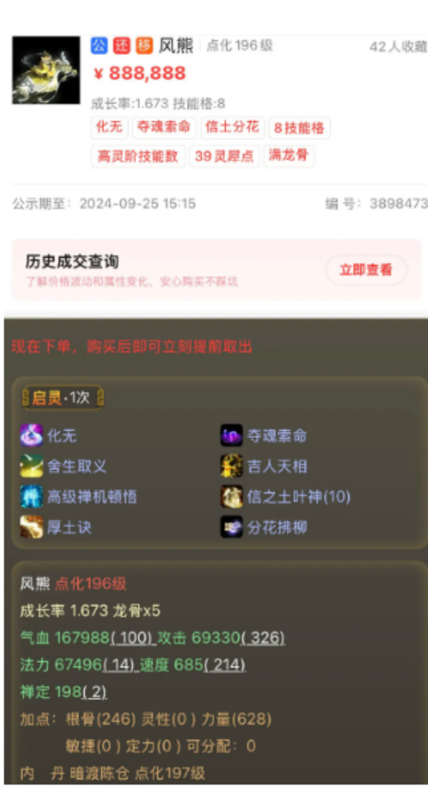 大事件!神豪“无远佛届”已经顶替盖子男人号,入驻桔子老板队伍!大君毒女人六阶武器曝光,三块十级宝石太晃眼!全服首只双终极风熊,猜猜定价多少?星芒换星符被截胡,两张抵不过一张?火武器展示炼器属性,太炸裂了! 老铁们好!今天的大话新鲜事栏目准时奉上,一起来欣赏其中的精彩内容吧! 一、确认!神豪“无远佛届”顶替盖子! 近日,原盖子战队成员有所变动,神豪“无远佛届”已经顶替盖子的男人号,并入驻了桔子老板的队伍,这支战队的实力也再一次迎来升级! 武器展示 25点潜能 据了解,“无远佛届”之前曾是石头蛋蛋的队友,而如今已移民众志成城服务器,加入了盖世无双帮派,目前只展示了一把6阶双特技混武器,25点潜能点的底子号也相当给力,兄弟们且待小编再探再报! 二、君临天下展示毒女6阶武器! 盖子队伍换人,而大君队伍却是风生水起,近日也展示出了毒女人的六阶武器,三块十级宝石相当晃眼,一起来欣赏! 武器全貌 蓝字克水23.8,炼器克水26.4,特技炼骨毒,更重要的是三块十级宝石,感觉已经超过武器本身的价值了? 三、首只双终极风熊,定价多少合适? 全服首只双终极风熊上架藏宝阁,一起来看看它的定价是多少,又是否合理呢? 风熊价格 备受瞩目的化无加夺魂索命风熊,已经完成上架操作了,而它的定价目前是88.88万,看起来还是比较随性的,不知有没有老板会直接将其拿下呢? 四、星芒换星符被截胡? 星芒换星符被截胡,两张还抵不过一张?什么情况,咱们一起来看看! 系统消息 系统消息 世界喊话 玩家用星芒换到两张星符,随后在世界频道喊话:“截胡了”,那么这到底是什么意思呢?原来是有人在他换的时候已经提前换到十四级星符了。 五、忽视火武器炼器炸裂! 玩家给自己的忽视火武器洗出极品炼器属性,这数据看起来也太炸裂了吧? 武器展示 底子忽视火29.8、加强雷42.3的武器,炼化克火22、火系狂暴几率11,炼器火系狂暴几率20.8,直接毕业,恭喜这位老铁! 今天的大话新鲜事就到这里了,感谢笑忘书、陌路繁华、一条咸鱼、那一天520等玩家们的热心投稿,小伙伴们如果在游戏内外碰见任何有意思的事情,都可以给我们投稿哦! [编辑:0892keia]