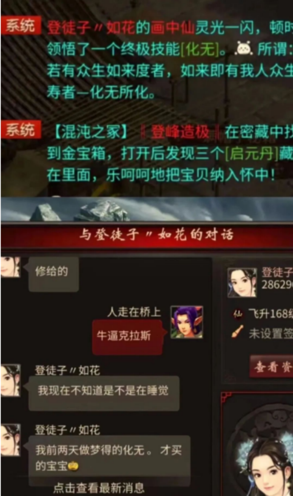 由盖子亲手打造的大力男鬼属性,猜猜到底有多强?梦境照进现实,花两万多买的画中仙起飞了!16级超级变态混,算是全服第一武器吗?神兽龙王售价2万多,这位大哥喝到假酒了吧!五百个珍稀神兽碎片集齐了,能换出啥? 老铁们好!今天的大话新鲜事栏目准时奉上,一起来欣赏其中的精彩内容吧! 一、盖子亲手打造的男鬼属性! 近日,盖子的大力男鬼号属性首次曝光,各项数据看起来极为养眼,兄弟们速速来围观! 属性展示 站街15.7万的攻击,抗性方面也几乎全部拉满,这应该是为了配合队伍的需求,自行切换的一套属性吧? 二、刚买的画中仙,瞬间就起飞了? 让梦境照进现实!玩家刚刚花两万多买的画中仙,直接就起飞了?一起来看看怎么回事! 购买信息 系统消息 来自水晶宫服务器的老铁,只因做了一个梦,梦到自己领悟了化无,所以果断从藏宝阁买了一只画中仙,结果在修罗的时候,真的直接领悟了化无,这就是梦境照进现实的快乐吗? 三、十六级BT混武器,目测是全服第一? 16级超级BT混武器现身,蓝字、炼化、炼器都相当夸张,兄弟来判断下到底是真是假? 武器全貌 底子忽视混7.2,蓝字加强混乱0.3,炼化忽视抗混10、加强混乱6,炼器忽视混5,完全就是所有属性顶满了啊,到底是真是假,咱们评论区见! 四、绝版泾河龙王,竟只售价2.6万? 神兽龙王售价2万多?这位大哥喝到假酒了吧,怎么摆了这么低的价格? 藏宝阁信息 正常来说,神兽龙王的身价在四万多,但红颜知己的某位玩家,竟然摆价26500?还是满灵犀、满级、满龙骨,技能打造完美的龙王,买到它的兄弟绝对血赚! 五、珍稀神兽碎片集齐,能换出什么? 经过一番辛苦搜罗,五百枚珍稀神兽碎片终于集齐了,来看看能不能换出神兽年! 系统消息 年没换出来,到手的只是一头白泽,按照目前的碎片价格来算,这波应该是亏了...... 今天的大话新鲜事就到这里了,感谢那年十八、登徒子〃如花、小范??、钟情丶小伯爵等玩家们的热心投稿,小伙伴们如果在游戏内外碰见任何有意思的事情,都可以给我们投稿哦! [编辑:109eks]